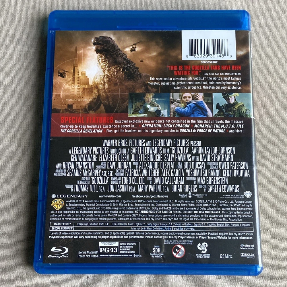 Godzilla (1) -starring Aaron Taylor-Johnson, Ken Watanabe, Elizabeth Olsen, Juliette Binoche, Sally Hawkins, David Strathairn, & Bryan Cranston + Directed by Gareth Edwards. 2014 Movie / Film. Widescreen. SDH, Subtitles. 123 Minutes. Special Features: Featurettes + Warner Bros. / Legendary Pictures release. Blu-ray & DVD 2-Disc Special Edition. Action / Adventure / Sci-Fi / Science Fiction / Thriller / Suspense / Horror / Creatures / Monsters / Apocalyptic / Survival / Chase / Escape / Aliens / Mystery / Investigation / Special Effects / Kaiju / Military / Drama / Epic / Family / Rescue / Disaster / Filming Light shelf / case wear (photos). Discs are clean with very light signs of use (photos) and in excellent, fully working condition. Tested. -the dvd data-side is pristine, the blu-ray data-side has some light marks (photos) Please view the provided photos, items specifics, and description. Please ask any questions. Thanks for checking out our page!