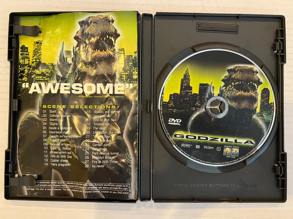 This DVD is a must-have for any Godzilla fan! The 1998 widescreen version delivers great visuals and nostalgic fun. The disc is in excellent condition, plays smoothly, and the action scenes still hold up. Perfect addition to a movie collection—highly recommended for fans of classic monster flicks!
