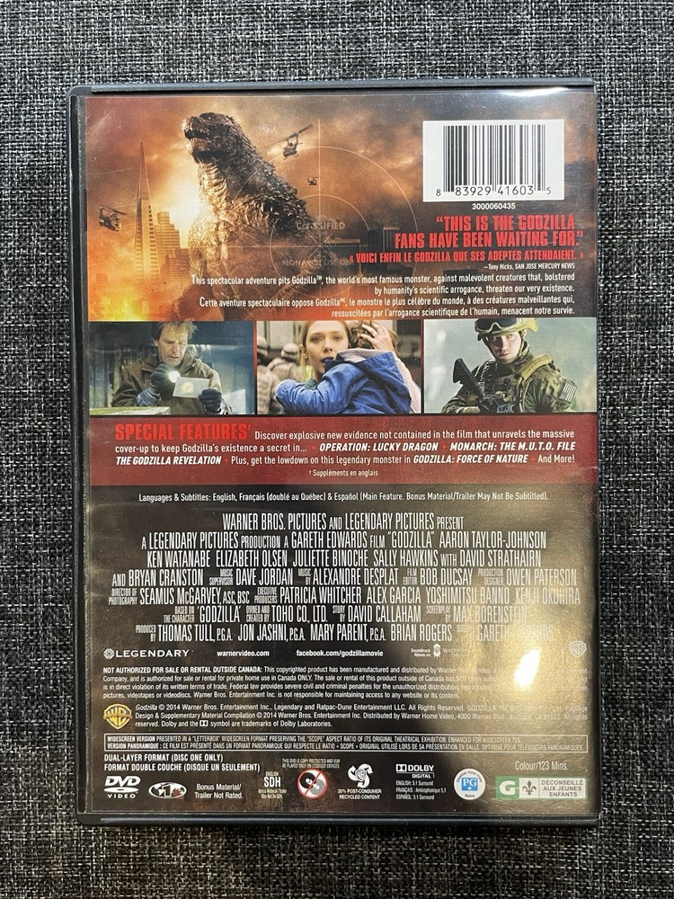 Embark on a thrilling journey with "Godzilla" on DVD, released in 2014 by Warner Bros. This action-packed science-fiction film delivers spectacular visual effects and a gripping storyline that fans of the genre will surely appreciate. Available in English, Spanish, and French, this DVD caters to a diverse audience and is compatible with Region 1 players (U.S., Canada). The DVD's discs are meticulously maintained, ensuring a near-mint quality for your viewing pleasure. Rated G, "Godzilla" offers an accessible and entertaining experience for all ages. Whether you're a longtime fan or new to the series, this film promises to be a valuable addition to your collection.