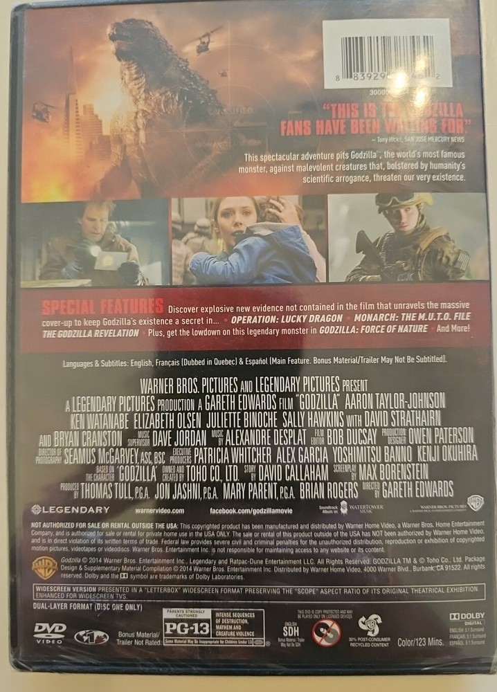 Experience the thrill of the colossal monster in this 2014 sci-fi movie, Godzilla. Directed by Gareth Edwards, the movie boasts an ensemble cast including Ken Watanabe, Elizabeth Olsen, Sally Hawkins, Aaron Taylor-Johnson, and Juliette Binoche. The movie is rated PG-13 and includes subtitles in English, French, and Spanish. The DVD features widescreen format and comes in a tall/DVD case. The movie is brand new, sealed and has a region code of DVD: 1 (US, Canada...). It's a perfect addition to your movie collection and an exciting watch for all monster enthusiasts.