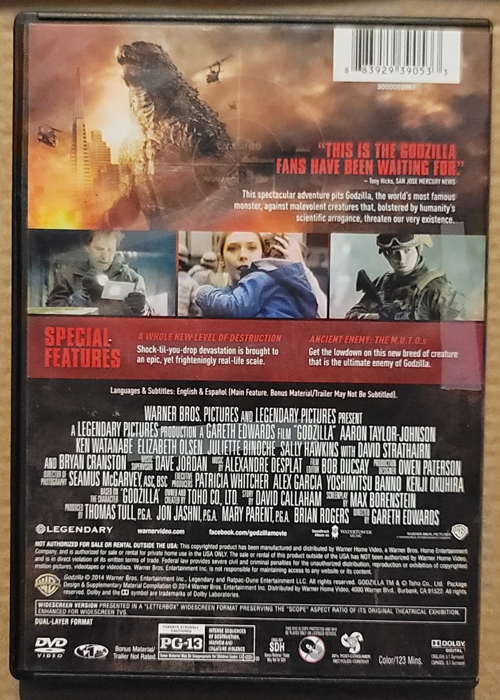 Surface scratches - tested and plays thoroughly. Case has imperfections such as scuffs, scratches and/or cracks. See pictures for condition, make sure to look at all sides, edges, and corners. Item pictured is the item you will receive. Payment due within 3 days of purchase. No international shipping. I do not ship to Canada, Hawaii, Puerto Rico, Alaska. Selling most of my collection, old and new. Make sure to check out my other listings. Smoke and pet free home. Allow 3 business days for shipping. No refunds. Not liable for damage caused by delivery service. Item leaves here as described in listing. Packaged well - however not responsible for how item arrives at destination. **IF** I do accept a return request, buyer pays for shipping - amount will be reduced from refund. Embark on a cinematic journey with the 2014 blockbuster "Godzilla" on DVD, a widescreen edition that brings the epic battle between the iconic monster and a group of explorers to your living room. With free shipping included, this purchase represents a tangible addition to any movie enthusiast's collection, inviting you to complete your Godzilla saga with this standout release.