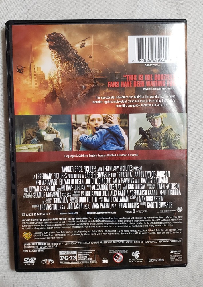 Godzilla c2014 DVD Color Movie Sci-Fi, Warner Brothers. PG13. 123 Minutes.