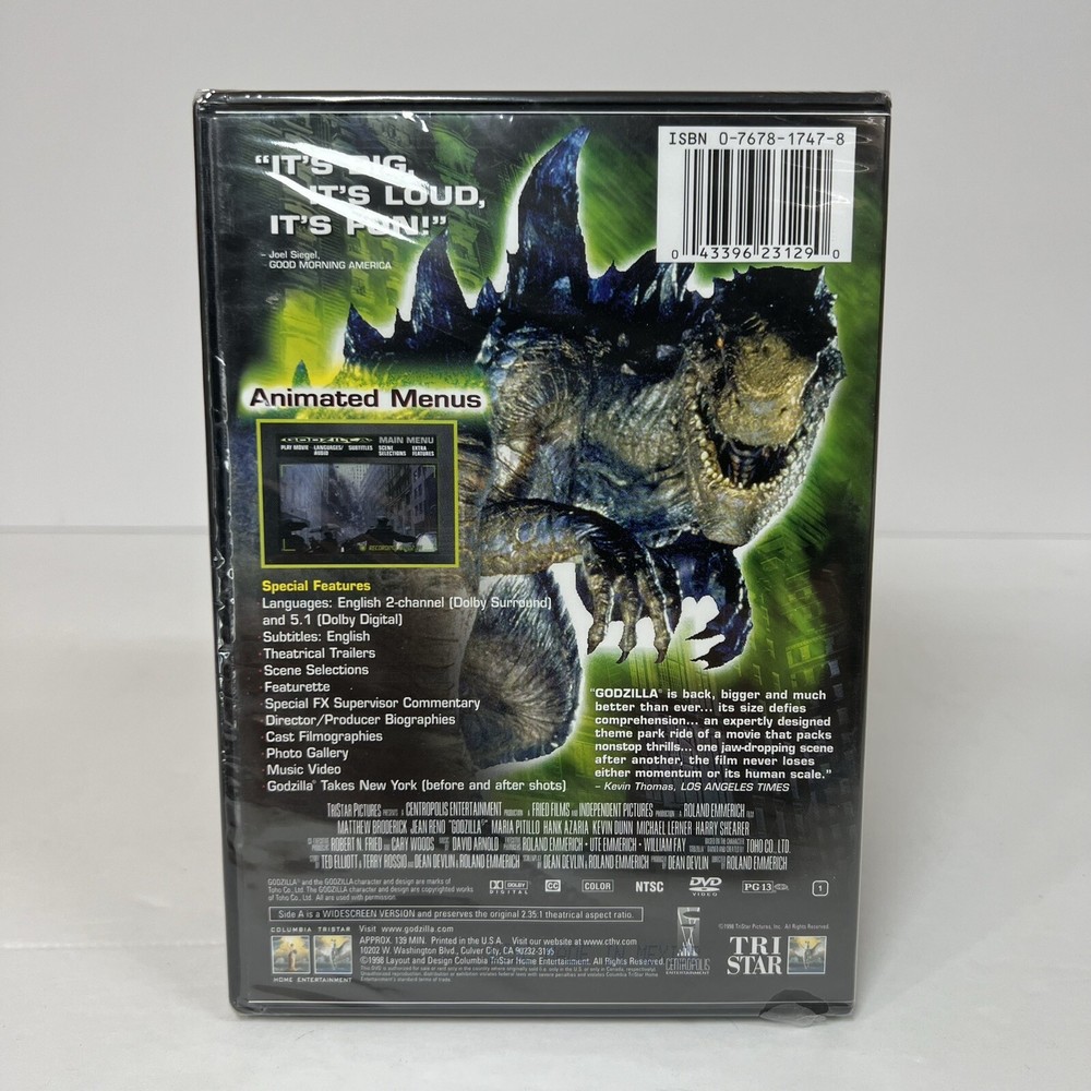 Factory sealed. Item in photos is exactly what you’ll receive. 1998 Godzilla Deluxe Widescreen Presentation DVD Experience the thrill of Godzilla like never before with this 1998 Deluxe Widescreen Presentation DVD! This rare collectible features the iconic giant lizard in all its glory, presented in a stunning widescreen format that captures every thrilling moment of the action. Features: - Deluxe Widescreen Presentation: Enjoy a cinematic viewing experience with enhanced visuals and expanded viewing angles. - Special Features: Includes exclusive behind-the-scenes footage, interviews with the cast and crew, and more. - Condition: New, Factory Sealed - Region: 1- Please check region compatibility before purchasing. This DVD is a must-have for any Godzilla fan or collector of classic monster movies. Don't miss your chance to own this unique piece of movie history! Fast shipping and secure packaging.Buy with confidence from a trusted seller!