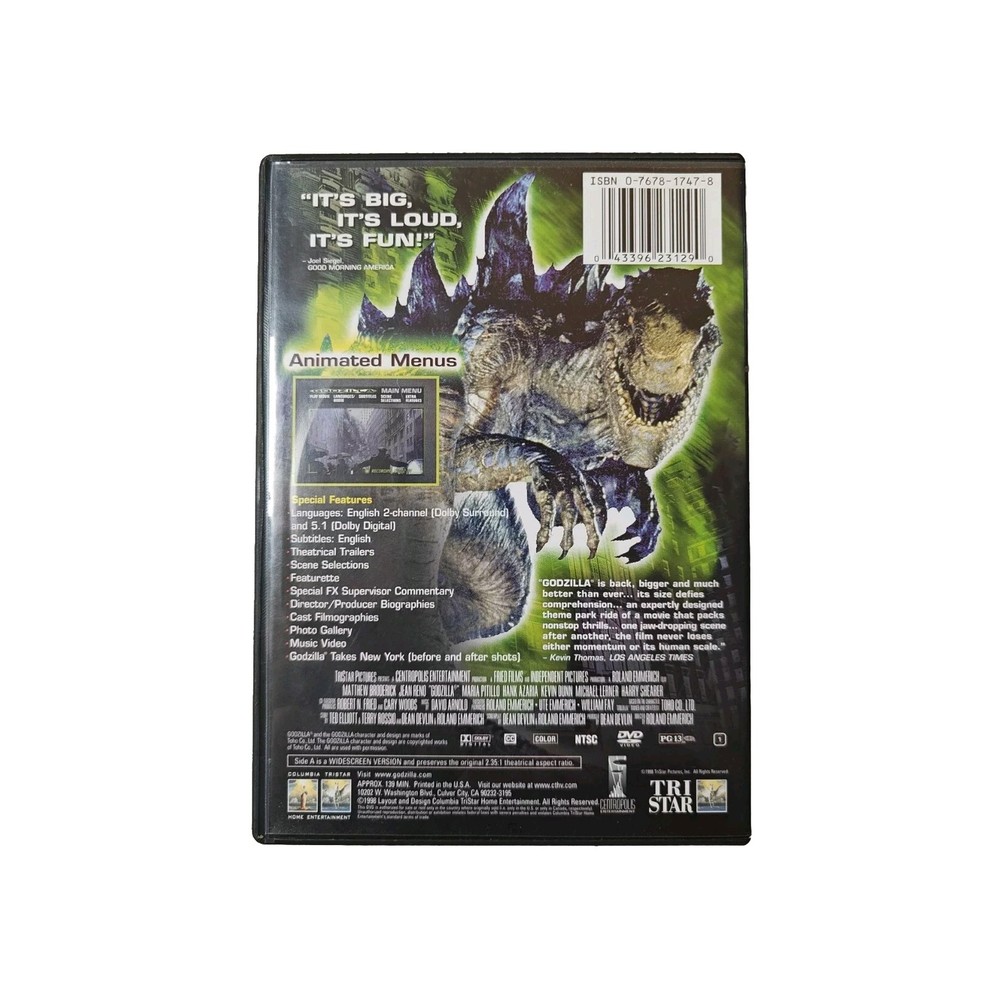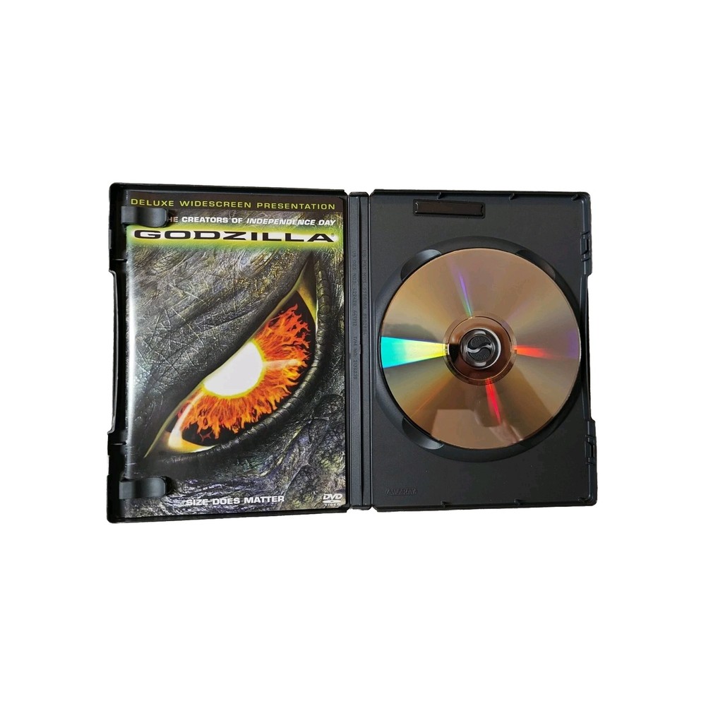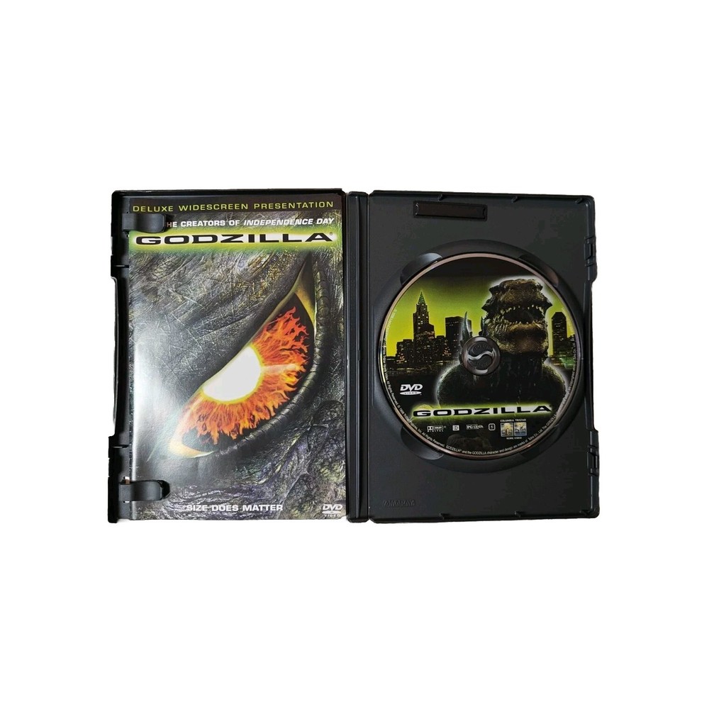 Overall good condition, light marks on disc but nothing notable. The "Godzilla" DVD is a special edition release from 1998 in widescreen format. Directed by Chuck Russell and produced by multiple individuals, this comedy video features additional scenes, behind-the-scenes featurettes, and commentary. It has a run time of 97 minutes and is a part of the Godzilla franchise. The DVD is in Jewel Case: Standard packaging and is rated PG-13. The subtitles are in English, and the language of the movie is also English.
