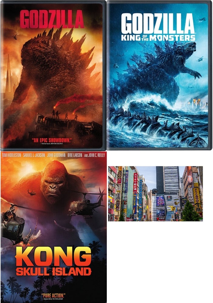 Godzilla, Godzilla King of The Monsters, and King Kong Skull Island Triple Feature 3 DVD Set Widescreen. Godzilla Description: A giant radioactive monster called Godzilla awakens from it's slumber to wreak destruction on it's creators. Runtime 123 Minutes Godzilla King of The Monsters Description: City-trampling smash sequel to the Big G's 2014 American re-imagining goes full monster party, as eco-terrorists seize Monarch technology designed to communicate with Earth's hidden leviathans-and use it to spur the beasts toward reclaiming the globe from humanity. With Rodan, Mothra, and King Ghidorah rampaging unchecked, will Godzilla right the scales... or add to the carnage? Kyle Chandler, Vera Farmiga, Millie Bobby Brown, Sally Hawkins, Charles Dance, Ken Watanabe star. Runtime 132 minutes. King Kong Skull Island: In 1973, government seismologist Bill Randa (John Goodman) sold his superiors on the notion that an uncharted isle in the Pacific held the keys to a generation's scientific advancement. His ragtag team of soldiers and researchers discovered the atoll's secrets, to their everlasting terror: scores of bloodthirsty mutated beasts and an uncanny giant gorilla lording dominion over all. Crowd-pleasing re-do of the fright favorite co-stars Samuel L. Jackson, Tom Hiddleston, Brie Larson, John C. Reilly. 118 min