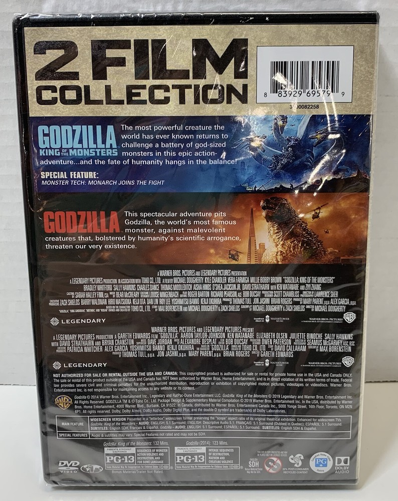 Experience the ultimate monster showdown with this DVD set featuring the iconic films Godzilla and Godzilla: King of the Monsters. In this epic adventure, witness the destruction and chaos that ensues as the mighty Godzilla battles to save humanity from terrifying dangers. Starring Aaron Taylor-Johnson, Ken Watanabe, Elizabeth Olsen, and more, this PG-13 rated film is perfect for fans of horror and filming. This DVD set includes two tall/DVD case format movies that come in English language with DVD region code 1 (US, Canada...). The Warner Home Video productions of Godzilla and Godzilla: King of the Monsters are sure to keep you on the edge of your seat. Don't miss out on this captivating movie collection that is perfect for a movie night with friends and family.