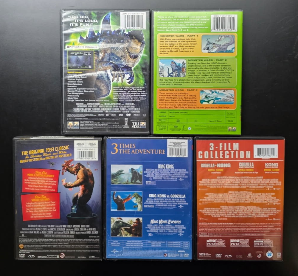 Godzilla / King Kong (DVD Lot) Animated Series, Triple Feature. The King Kong Triple Feature is New Sealed. Some of the other DVD discs have been cleaned with a professional machine and are guaranteed to play. Shipping: All Movies, Music and Books are shipped USPS Media Mail Economy unless another shipping option is requested. Combined Orders: Any shipping overage is refunded to the buyer on purchases of more than one item.