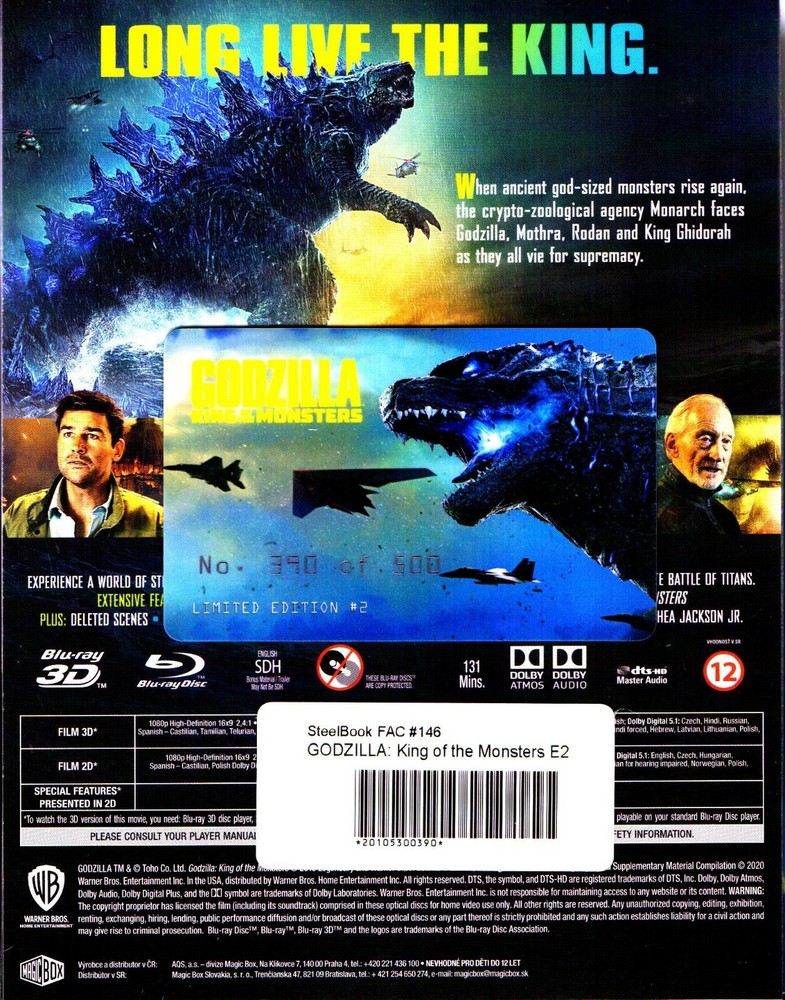 Godzilla: King of the Monsters 3D XL Double Lenticular SteelBook (Czech)(3D Blu-ray/Blu-ray) No Dents, Loose Disc or a Spine Slash (Before Opening) Customs Friendly - Combined Shipping for All Countries (Look Below) Film Arena Version - Ships in a Box - Region Free - Ships Next Day This is for Godzilla: King of the Monsters 3D XL Double Lenticular SteelBook from Czech. This includes the 3D, blu-ray disc of the film in a SteelBook case. There are no dents on the SteelBook as far as I can see. Due to being unopened I can't be responsible for any damage once item is opened. Please inspect SteelBook before opening. This also comes with a SteelBook protective case. These editions are also numbered, the picture may not be the exact number you receive. These discs are the Czech version but may also contain audio and subtitles for other languages. If there are no details below contact me to find out. I am willing to ship anywhere in the world. This will be shipped in a box for protection and all shipments come with a tracking number . Combined Shipping for additional items purchased (Automatically calculated in cart) Remember To Look At My Other Items!
