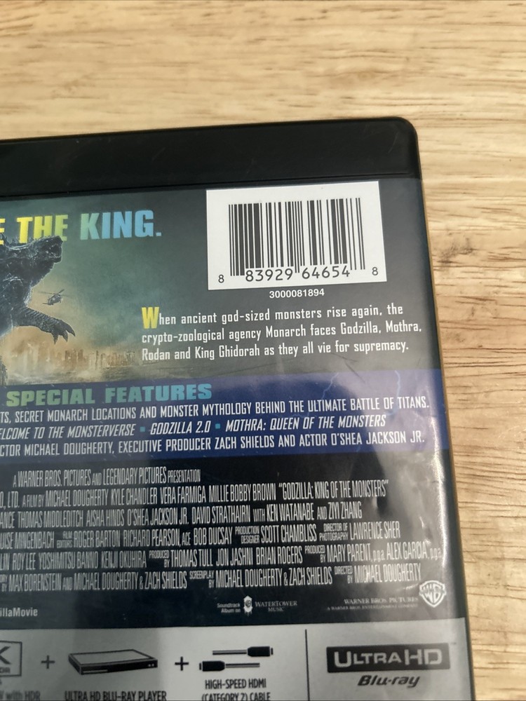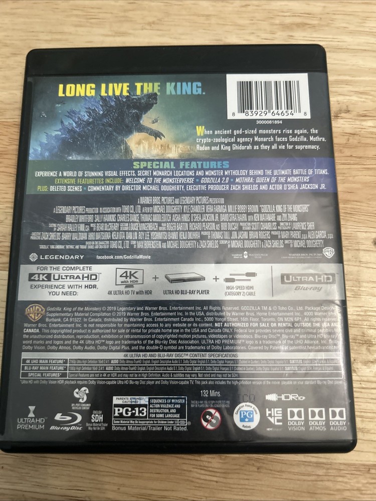 Authentic US Release, Exactly as pictured Experience the epic battle for supremacy in the land of the giants in "Godzilla: King of the Monsters" on 4K Ultra HD. This action-packed science fiction movie directed by Michael Dougherty showcases the incredible talents of the Great Ones as they fight for dominance. With a run time of 132 minutes, this movie is packed with thrilling features including a behind the scenes featurette, commentary, and widescreen viewing. This black 4k case movie is rated PG-13 and offers subtitles in Cantonese, Chinese, English, French, Korean, and Spanish. It is compatible with Blu-ray Region Code A (Americas, Southeast Asia...) and offers an Ultra HD format for an immersive viewing experience. Get your hands on this Warner Home Video studio release from the United States and join the adventure in the land of the giants.