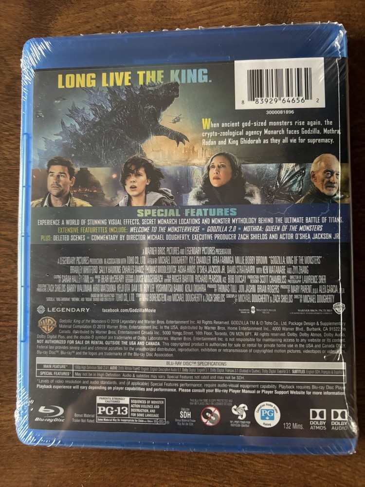 The product is a brand new, sealed Blu-ray of the movie "Godzilla: King of the Monsters" directed by Michael Doughery. Warner Home Video studio released this special edition in 2019 with English, French, and Spanish subtitles available. The Blu-ray features a widescreen aspect ratio of 16:9, with a runtime of 132 minutes. The film falls under the action genre with a PG-13 rating, and includes special features. It is part of the Monsterverse franchise and stars actors Kyle Chandler, Millie Bobby Brown, and Vera Farmiga. **Vicki’s Variety Store WIILL COMBINE SHIPPING TO SAVE YOU MONEY IN SHIPPING!!! You can combine shipping by placing more than one item from my store in your cart and then click on "Request Combined Shipping" and I'll send you an invoice with your shipping savings. Or if you have already purchased more than one item from my store before I have shipped them out, I will combine your items into one package and refund to you the extra shipping costs that are not needed. Note that media (films, dvds, blu-rays, books) ship at a reduced rate from the USPS so combining shipping saves you much money. Message me with questions*!