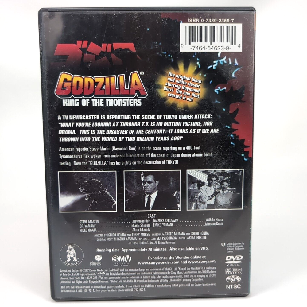 Welcome to my eBay listing for the Godzilla King of the Monsters (DVD, 2002) , featuring the original 1956 Godzilla movie classic with Raymond Burr! This film is an absolute must-have for any Godzilla fan or collector of classic monster movies. Relive the excitement and thrills of the very first Godzilla movie that sparked a worldwide monster franchise! Why You'll Love This DVD Classic Monster Movie: This is the movie that started it all—the original Godzilla terrorizing Tokyo, filled with unforgettable scenes and incredible vintage special effects. Historic Cinema: Not just a movie, but a piece of cinematic history that influenced monster movies for decades. Perfect for Collectors and Fans: A must-own for anyone who loves monster films, Japanese cinema, or vintage horror. Condition: This DVD is in very good condition, with both the disc and case well-maintained. It has been carefully handled and stored, showing only minimal signs of use. Enjoy a clean viewing experience from start to finish. Take Action Now Don’t miss your chance to own this rare piece of film history! With "Buy it Now or Best Offer," you can secure this collector's item right away—or, if you’re serious about adding this to your collection, make your best offer! Save this listing to your favorites, and who knows, you might get a special offer from us! Collectors, Godzilla fans, and classic movie lovers—this is your chance to bring the King of Monsters into your own collection. Make an offer today, or risk missing out!