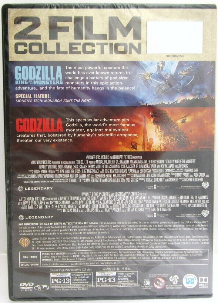 Godzilla: King of the Monsters (2019) & Godzilla (2014) 2-Film Collection New DVD Movie Godzilla: King of the Monsters is a 2019 monster film directed by Michael Dougherty and co-written by Dougherty with Zach Shields. A sequel to Godzilla (2014), it is the 35th film in the Godzilla franchise, the third film in Legendary's MonsterVerse, and the third Godzilla film to be completely produced by a Hollywood studio. It is dedicated to executive producer Yoshimitsu Banno and original Godzilla suit performer Haruo Nakajima, both of whom died in 2017. The film stars Kyle Chandler, Vera Farmiga, Millie Bobby Brown, Bradley Whitford, Sally Hawkins, Charles Dance, Thomas Middleditch, Aisha Hinds, O'Shea Jackson Jr., David Strathairn, Ken Watanabe, and Zhang Ziyi. Godzilla is a 2014 American monster film directed by Gareth Edwards. It is a reboot of Toho's Godzilla franchise and is the 30th film in the Godzilla franchise, the first film in Legendary's MonsterVerse, and the second Godzilla film to be completely produced by a Hollywood studio. The film stars Aaron Taylor-Johnson, Ken Watanabe, Elizabeth Olsen, Juliette Binoche, Sally Hawkins, David Strathairn, and Bryan Cranston. In the film, a soldier attempts to return to his family while caught in the crossfire of an ancient rivalry between Godzilla and two parasitic monsters known as MUTOs. Click here to see more DVDs and Blu-rays
