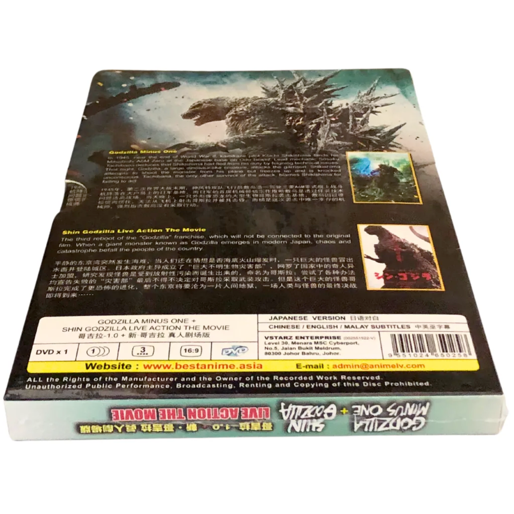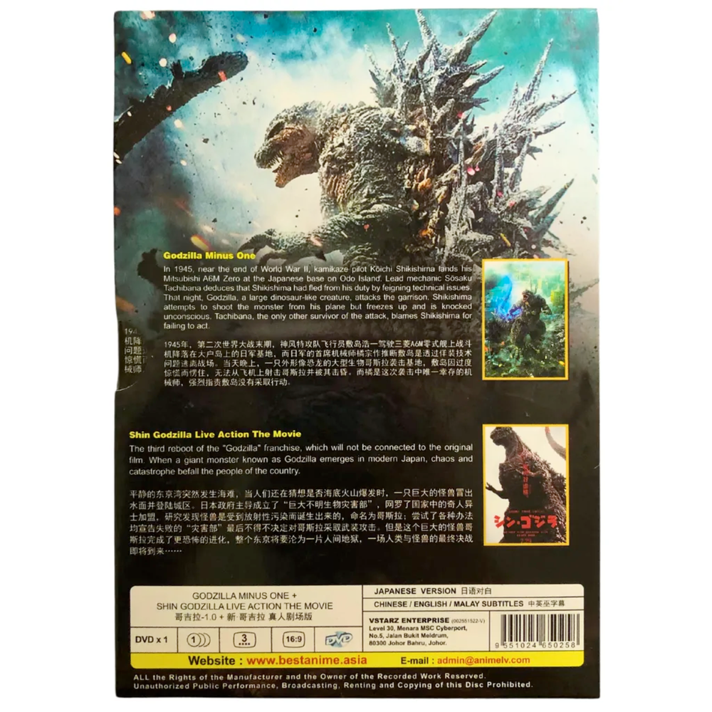 Godzilla Minus One (2023) + Shin Godzilla (2016) Live Action Movie DVD [English Subtitle] Product Description Experience two iconic live-action Godzilla movies in one thrilling DVD set: Godzilla Minus One (2023) and Shin Godzilla (2016) . This DVD offers the epic return of the famous kaiju in stunning widescreen format with Japanese audio and English, Chinese, and Malay subtitles. With heart-stopping action, cutting-edge special effects, and captivating performances, this double feature is a must-have for Godzilla fans. Presented on 1 disc, this DVD is region-free, ensuring it can be enjoyed on any DVD player worldwide. Product Highlights Movies Included: Godzilla Minus One (2023) & Shin Godzilla (2016) Audio: Japanese Subtitles: English / Chinese / Malay Format: DVD (Widescreen 16:9), All Region (Playable Worldwide) Disc: 1 DVD Genres: Action, Sci-Fi Condition: Brand New, 100% Original & Licensed Starring: Ryunosuke Kamiki, Minami Hamabe, Yuki Yamanda Synopsis In Godzilla Minus One (2023) , the kaiju emerges in post-war Japan, a country already devastated and trying to rebuild. Godzilla’s return is a terrifying blow, leaving Japan to face its most deadly adversary yet. This gripping story of destruction and survival is paired with Shin Godzilla (2016) , where the monster reawakens in modern-day Tokyo, wreaking havoc on the city. The Japanese government scrambles to respond to the unrelenting force of nature, leading to a tense and action-packed battle between humanity and the legendary kaiju. Both films explore the terrifying power of Godzilla, combining breathtaking visuals with deep human drama. Contact Us You can contact us anytime through eBay messages if you have any questions, comments, or product requests. We will respond within 24 hours and do our best to help you! We encourage you to reach out with any questions or concerns. We want to make sure you are completely happy with your purchase. Payment We accept payment through eBay-managed payment. We will ship the item only after full payment is received. Please complete payment within 5 days of your purchase. If not, it will result in an unpaid item dispute. Shipping The products will be shipped using Economy Shipping from Malaysia. We will prepare your order within 1-3 working days and provide a valid tracking number. All products are carefully packed with bubble wrap to prevent damage during shipping. Delivery usually takes between 11 to 23 business days. Return If you have any problems with your order, please contact us via eBay message. We are happy to help and will solve the problem as soon as possible. You can return items within 30 days if they are in good condition. Feedback Your feedback is highly valued and greatly appreciated. We genuinely care about your experience with us, and if there are any aspects that fall short of your expectations, kindly inform us before leaving any feedback. We prioritize our customers and treat your concerns with the utmost seriousness. We are committed to working together to find a satisfactory resolution. Please reach out to us via eBay Messaging, ensuring that you include your contact information and order number. Thank you for choosing to shop with us. Notes The item price and shipping cost do not include import duties, taxes, or extra fees. The buyer is responsible for paying any customs duties and taxes. The item's color may differ slightly from the pictures due to monitor brightness and light conditions. The style of the item is exactly as shown in the pictures. Free eBay listing template designed by dewiso.com