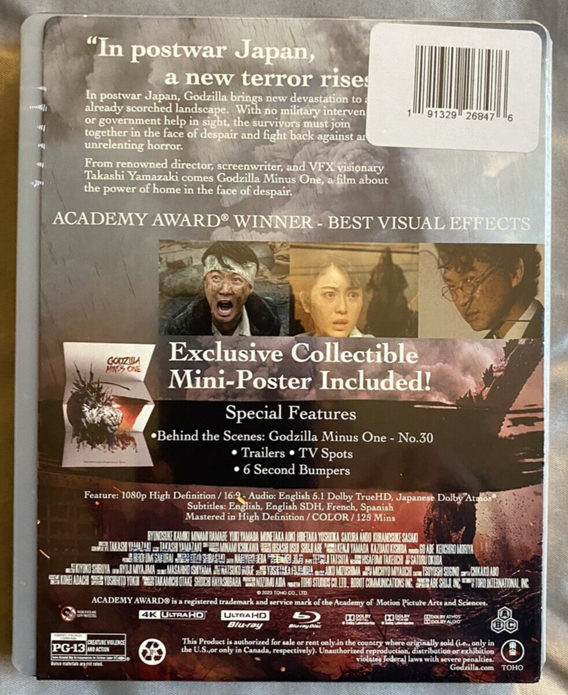 Out of Print!!! Exclusive Mini-Poster Included!!! Godzilla Minus One 4K Steelbook 4K Ultra HD + Blu-ray (there was no digital code included with this item) There are no visible scratches or dents on, nor loose discs in, the steelbook. You may combine purchases for a shipping discount, but please try to limit individual purchases to five items and know you will be limited to bidding on and purchasing 10 items within a 10-day period . Steelbooks are wrapped in plastic bubble wrap then shipped in a box filled with packing material. I list 3 days for handling, but usually items are shipped within 1-2 days. Sorry but I do not haggle, send or accept offers, however my prices fluctuate and I have auctions that begin and end Sundays and run for a week. Items won on an auction ending Sunday must be paid for by Thursday night...sorry, but no holds until the next auction. All items are sent USPS Ground Advantage or Media Mail. Positive feedback is automatically returned once left. Thank you for your time and have a great day.