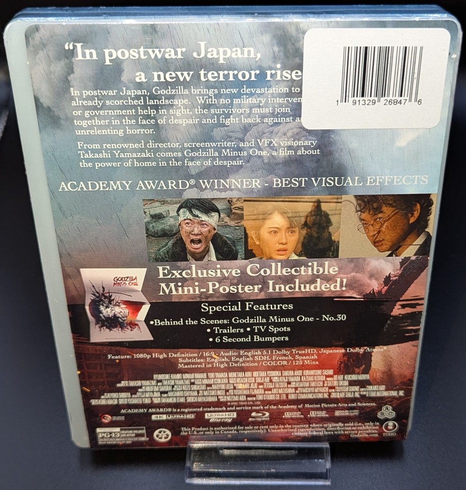 Specific to steelbook listings (Please read): *I will provide as many pictures and specifics as possible pertaining to the condition and quality of the steelbook. If there are noticeable defects, chips, etc; pictures will be included in the listing along with documentation. If you'd like an additional picture or have any questions, please feel free to ask.* *Steelbooks may have some flaws that aren't evident until the factory wrapping has been removed. With that, steelbooks solely factory sealed in plastic may have markings or scratching from transit, shelf life, etc. Without opening the steelbook entirely, there's no method of 100% confirming whether or not a scratch has transferred to the steelbook itself. This is the unfortunate situation with this method of factory prep for steelbooks and is beyond my control. Returns will not be accepted for any of the above mentioned factory produced flaws that may occur with steelbooks. All other return requests within the 14 day window will be considered on a case by case basis if applicable. *Effective 9/5/15, all steelbooks (game, movie or collectible) are wrapped in bubble wrap and then shipped in a box for safe delivery. Note: With any 4K/blu-ray/DVD/game, the disc(s) may become loose from the holder(s) during transit. I'm unable to prevent this and, should this occur, this will not be considered a factor for a return of product. Regarding digital content (if applicable): I'm unable to validate any digital content inside sealed packaging. Digital content, if applicable, is not factored into the listing price and is considered a bonus if still redeemable. This listing is for the steelbook of Godzilla: Minus One on 4K Ultra HD & blu-ray with slipcover. An exclusive mini poster is also included. This is a Limited Edition steelbook. This disc is Region Free. Each steelbook comes enclosed in cellophane with a slipcover. Considering the wrapping method, the slipcover won't be perfect and may have some areas of light wear. Please review all pictures and reach out if you have any questions. All sales final. No returns accepted. Please do not hesitate to contact me with any questions. Submit payment within 48 hours of choosing Buy It Now or winning auction end time. Unpaid item cases are automatically opened after 48 hours of non-payment. Email to coordinate alternate time-frame if necessary. ***INTERNATIONAL CUSTOMERS*** For the protection of the seller and the buyer, international shipping will only take place if partial or full tracking is available. This would leave Priority Mail (which is required for anything over 4 lbs) or any other form of shipment providing this level of tracking from seller to buyer. While being more costly, Priority Mail is much faster and provides extensive tracking in most instances. Please communicate any concerns beforehand. Any Duty, VAT or additional taxes that may be charged after the sale will be the sole responsibility of the buyer. Before bidding, please research and confirm any local regulations related to buying exported goods.