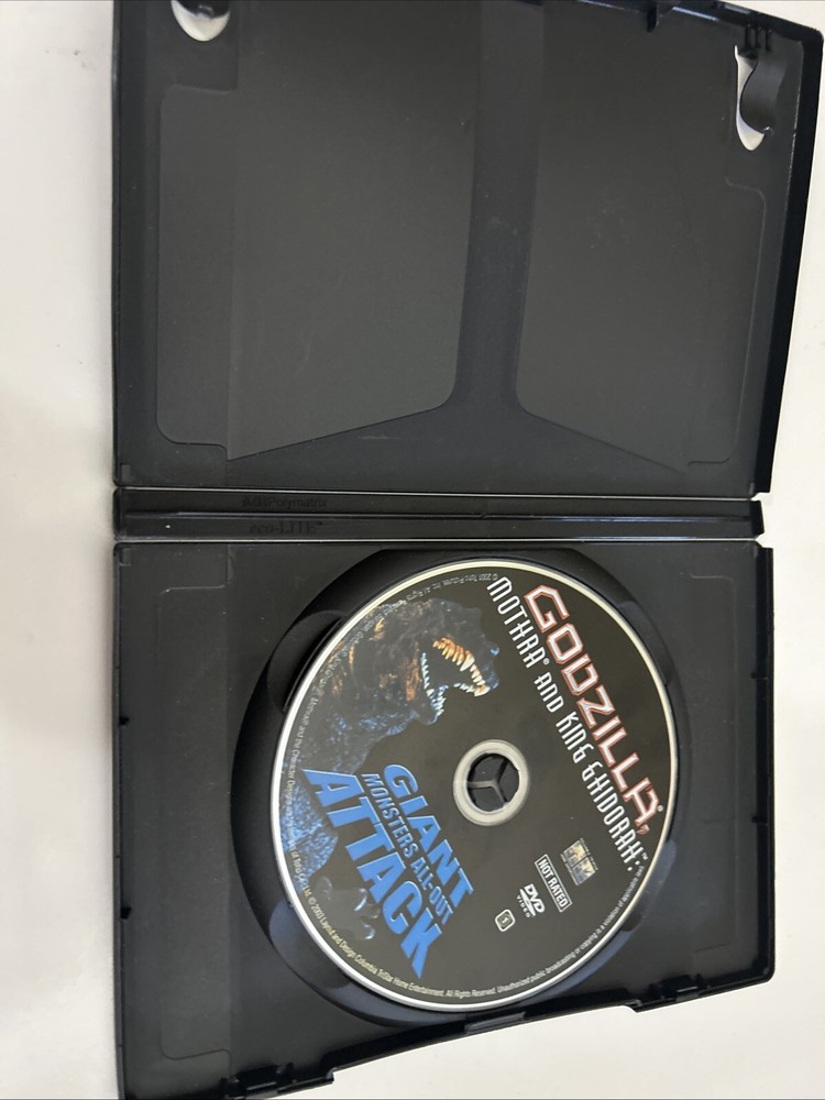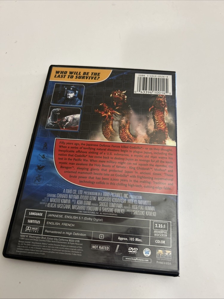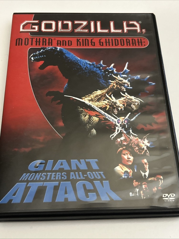 This is a DVD of the movie "Godzilla, Mothra, and King Ghidorah: Giant Monsters All Out Attack," released in 2003. The film is in English and Japanese languages, with a NTSC video format. It is rated NR and belongs to the Sci-Fi & Fantasy genre, featuring creatures/monsters and Japanese sub-genres. The DVD comes in a tall/DVD case, is formatted for Region Code 1 (US, Canada), and was manufactured in the United States.
