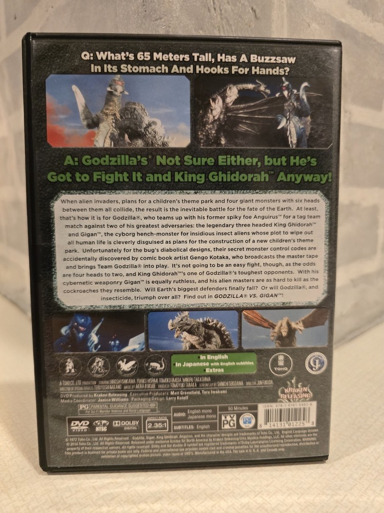 This DVD is a must-have for Godzilla fans! The battle between Godzilla and Gigan is action-packed, and the film’s quirky charm shines through. The original dubbing and subtitled Japanese audio make it a fun throwback to classic monster movies. The full-screen format preserves that nostalgic vibe, and the limited release makes it a cool collector’s piece. Whether you're into retro sci-fi or just love giant monsters duking it out, this kraken-released gem delivers classic kaiju entertainment. Highly recommended for fans of vintage creature features!