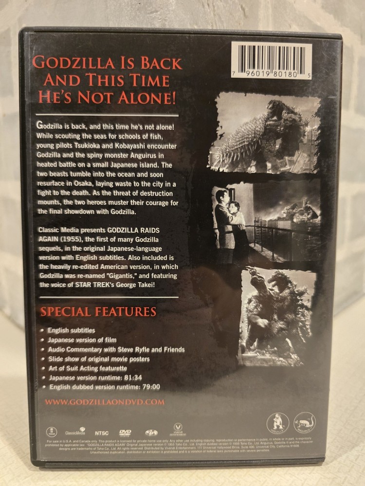 "Godzilla Raids Again" is a collector's edition DVD from 2007, featuring the iconic monster Godzilla in a cult classic sci-fi and fantasy film. The DVD includes English and Japanese subtitles, commentary, and is dubbed for enhanced viewing experience. With a 4:3 aspect ratio and presented in NTSC video format, this DVD is perfect for fans of the Godzilla franchise and those interested in creature/monster and alien-themed movies. The film is rated NR and is sure to entertain viewers with its thrilling and action-packed storyline.
