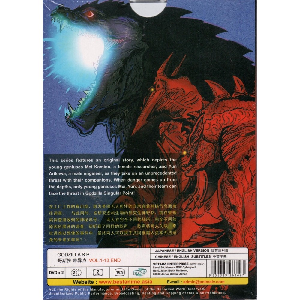 Immerse yourself in the epic world of kaiju battles and sci-fi intrigue with Godzilla S.P Singular Point Vol. 1-13 End Anime DVD. This collection brings the legendary Godzilla to life in a thrilling anime series. Whether you're a long-time Godzilla fan or new to the franchise, this DVD set is a must-have. It also makes a thoughtful and exciting gift for anime enthusiasts and collectors who appreciate high-quality storytelling and animation. Product Specifications Category : DVDs, Blueray & CDs Type : TV Series Product Description Title : Godzilla S.P Godzilla Singular Point Vol. 1-13 End No. of discs : 2 discs (1-13 Episodes) Version : Japanese/English Subtitle : English/Chinese Genres : Anime, Action, Sci-Fi Synopsis: This series features an original story, which depicts the young geniuses Mei Kamino, a female researcher, and Yun Arikawa, a male engineer, as they take on an unprecedented threat with their companions. When danger comes up from the depths, only young geniuses Mei, Yun, and their team can face the threat in Godzilla Singular Point! Don't miss the chance to own Godzilla S.P Singular Point Vol. 1-13 End Anime DVD and witness the clash of titans in a captivating anime series that pays homage to the iconic monster's legacy. Get ready for a cinematic journey filled with suspense, action, and the legendary roar of Godzilla! Episodes (1-13) : 1. Terzetto / A Distant Road 2. Gamesome / Midsummer Oni Festival 3. Tigerish 4. Gadabout / The Future Not Yet Seen 5. Theorist / Swift As The Wind 6. Enfatico 7. Omniarch 8. Graftage 9. Erumpent 10. Encipher 11. Relaunch 12. Explore 13. Together Payment Currently we accept payment through eBay managed payment. When eBay manages payments, buyers can pay using most major credit cards, debit cards, Apple Pay, Google Pay, PayPal, and other locally accepted forms of payment depending on the listing site. Shipping All orders will be shipped through Economy or Express shipping from Malaysia. If applicable, some items might be shipped from our local US fulfillment centers. Normally, it will take up to 3 days for us to pack and ship your item. Note that the delivery time frame is 14 - 21 business days (for Economy) and 3 - 5 business days (for Express/shipped from our local US fulfillment centers). Returns Items can be returned for exchange or full refund within 30 days from the date you receive your merchandise, provided that the item is unused and in its original packaging. Return shipping is the buyer's responsibility unless the return is a result of our mistake or otherwise stated. We are not responsible for any purchase after this 30-day period.