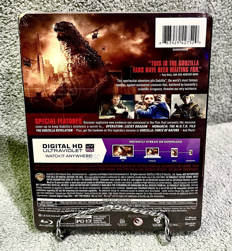 In this gritty, realistic sci-fi action epic, Godzilla returns to its roots as one of the world's most recognized monsters. Directed by Gareth Edwards and featuring an all-star international cast, this spectacular adventure pits Godzilla against malevolent creatures that, bolstered by humanity's scientific arrogance, threaten our very existence. The Limited Edition Godzilla MetalPak includes exclusive embossed artwork, the Blu-ray Combo Pack and Godzilla’s iconic roar! Up for grabs, a Brand new/ factory sealed, rare and hard to find, no dings or dent on the case, no tears on the shrink wrap, disc(s) are intact, definitely pristine and awesome condition, get yours now while you can. Bid/buy with total confidence, please check my listings for other great, rare and collectible items, thank you for stopping by, message me if you have any questions, thanks again and take care..