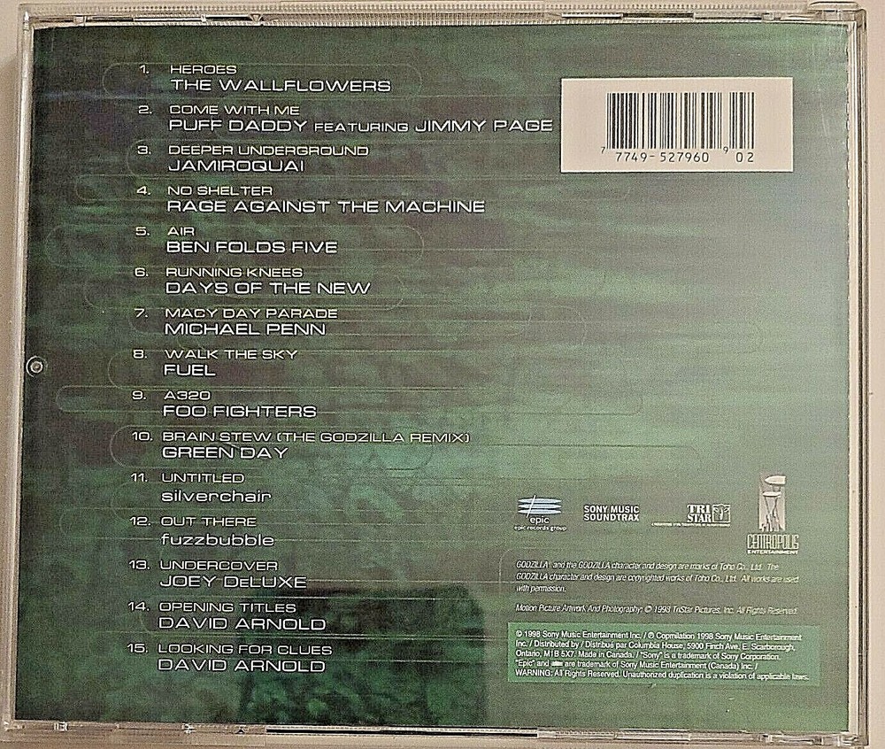 A Canadian Import. The cd is in like new condition, and the jewel case has been replaced to new. ---- Godzilla: The Album by Original Soundtrack (CD, May-1998, Sony Music Distribution (USA)) Music > CDs Product Identifiers Record Label Sony Music /Columbia House Canada UPC 777495279609 eBay Product ID (ePID) 3279624 Product Key Features Artist Original Soundtrack Format CD Release Year 1998 Style Film Score/Soundtrack Release Title Godzilla: The Album Genre Film Composers, Rock, Rock & Pop Additional Product Features Spar CODE N/A Playing Time 59min. Distributor Sony Music Distribution Recording Type Studio Recording Mode Stereo Release Date 19980519
