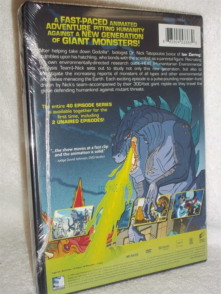 PLEASE READ BELOW BEFORE BIDDING AND ASKING ANY QUESTIONS ITEM DESCRIPTION This DVD is BRAND NEW!! FACTORY SEALED!! NEVER OPENED!! It includes all the original cases, covers, inserts and, of course, the disc(s) itself. Product Description Voices of Ian Ziering, Malcom Danare, Rino Romano. After Dr. Nick Tatopoulos brings down Godzilla, he finds his hatchling and raises it as his own. He recruits a team of specialists known as HEAT and with the 300-ft. reptile offspring in tow, they travel the world researching a new generation of monsters and defending mankind against mutant anomalies. Includes 40 episodes on 4 DVDs. Animated. 1998-2000/color/14 hrs., 14 min/NR/fullscreen. OUR TERMS AND GUARANTEES We will contact the auction winner(s) via email within 24 hours of auction close with any specific instructions that may be necessary to complete the transaction. We will also notify the auction winner(s) when their order has been shipped by sending an email to their ebay email address. WE DO NOT SELL illegal bootleg tapes, copies, screeners, or any type of illegally burned CDs/DVDs! ALL ITEMS ARE FACTORY ORIGINALS and, unless otherwise noted, include their ORIGINAL US factory made cases, inserts/game book and, of course, the items themselves. All DVDs are GUARANTEED. If you receive a damaged, defective or otherwise unusable item from us, please inform us within 15 days of shipment and we will replace the defective product. In the event that the defective item is no longer available, we will substitute for another item, credit your account or issue a refund minus the Shipping. Buyer must make contact within 3 days of the end of auction and payment must be made within 10 days of the end of auction. Please have funds ready to send when you are bidding. Your personal information will never be shared or sold to anyone. Your transaction is strictly confidential, and you will receive your product in discreet packaging . Finally, there should NEVER be a reason to leave us negative feedback. That is NOT the proper way to get our help with a problem, just contact us and give us a chance to provide an appropriate solution. Permanently hurting our reputation by leaving us negative feedback or threatening negative feedback will NOT get you the service you are looking for, again, just email us if you have a problem with your purchase. PAYMENT TERMS Payment is expected within 10 days after the auction closes. Please include the following with your payment: Username Auction number(s) Item name Shipping Address We accept the following forms of payment: . PAYPAL Credit Cards (Contact us for details) SHIPPING TERMS Your DVD(s) will be shipped within 48 hours of receipt of payment. All DVDs will be shipped discreetly . The flat rate shipping fee using USPS FIRST CLASS MAIL is $ 3.00 for the 1st DVD, $2.00 for each additional within the USA . International orders, INCLUDING CANADA, using USPS AIRMAIL are $20.00 for the first DVD, $5 for each additional. Rush and Expedited shipping options are available to most areas; please feel free to contact us for pricing and other details regarding the auction. I COMBINE SHIPPING Please View Our Other Auctions And Save On Shipping Powered by SixBit's eCommerce Solution
