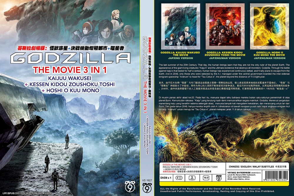 Godzilla The Movie 3 in 1: Kaijuu Wakusei / Kessen Kidou Zoushoku Toshi / Hoshi wo Kuu Mono - *English Dubbed* Godzilla 1: Kaijuu Wakusei ( Planet of the Monsters ): Twenty thousand years after the fall of humanity, Earth succumbed to legions of ravenous creatures who now freely roam the planet. Far away in the depths of space, the last surviving members of humanity float aimlessly in the same ship they escaped Earth with so many years ago. With the spacecraft running dangerously low on resources, the survivors' leading council must decide on their path forward: should they continue to gamble on finding another Earth-like planet to inhabit, or take to heart an anonymous essay theorizing what may be the only weakness of the "Godzilla," who forced the last remnants of humanity off their home world? The author of the controversial essay is Haruo Sakaki, a man who witnessed the death of his parents to Godzilla at a young age, which has led him to harbor an obsessive hatred for the monster. Now, he spearheads the operation aimed at reclaiming humanity's birthright from the king of monsters and slaying him once and for all. But, alongside humanity, Earth has undergone drastic change since their departure; Godzilla and its numerous spawns may pale in comparison to the darkness lurking within the hearts of this close-knit community of survivors. Godzilla 2: Kessen Kidou Zoushoku Toshi ( City on the Edge of Battle ): After a desperate battle and many losses, humans finally slay Godzilla—the monster that caused humanity to flee Earth 20 thousand years prior. But the creature Haruo Sakaki's troops killed was not alone; there existed another Godzilla on Earth yet to be defeated. Grievously wounded from the first conflict, Sakaki wakes up in the home of a young girl who is a member of the Houtua tribe. Bearing a shocking resemblance to humans, the Houtua have adapted to survive the changed climate of the planet that had long been abandoned. With most of their resources depleted, the remaining members of Sasaki's special forces struggle with the decision to abandon their mission and their home planet or to fight an improbable battle. Hope is not completely lost however, as the members from the Bilusaludo race of aliens discover remnants of their anti-Godzilla weapon Mechagodzilla. Even with this powerful weapon in their arsenal, victory seems impossible to grasp: Godzilla has spent all this time evolving and preparing to defeat anyone who dares to challenge its superiority. Godzilla 3: Hoshi wo Kuu Mono ( The Planet Eater ): With the defeat of the Bilusaludo's nanometal city, the destruction of humanity seems inevitable. Worse yet, Captain Haruo Sakaki's refusal to sacrifice his humanity has come under fire from the remaining Bilusaludo troops, who blame him for their defeat. In their darkest moment, the few surviving humans turn to the religion of the Exifs, which promises that devotion is the path to salvation from Godzilla. However, the Exif are not what they seem. As the survivors become more and more zealous in their devotion, Sasaki wonders what exactly the priest Metphies is hiding—especially regarding his relationship with the monster known as Ghidorah. DVD Details Number of Disc. 1 DVD Episodes 3 Movies Audio (Dialogue) English / Japanese Subtitled English / Chinese / Malay DVD Region Coding Region Free, All (NTSC) Product Description The item that you are looking at is Brand New and Factory Sealed! Item is exactly as shown on photo and noted in description . Item is imported from Malaysia. We Sell Only Original/Genuine DVDs. All DVDs are from Licensed Publisher in Malaysia.All DVDs come with Original Sealed Authenticated Sticker / Hologram by Malaysia Censorship Board. Item is 100% Authentic/Genuine Malaysia Edition, Certified/Approved by Malaysia Government both from Cooperatives and Consumerism Ministry (KPDNKK ) and Kementerian Dalam Negeri (KDN) If you have any questions, Please ask before you purchase. Thank you for looking Shipping: To combine orders, you'll need to add all items to ebay's cart first, then checkout as a single invoice in order for discount on shipping fee to apply . If you do each orders separately, you will be charged shipping fee separately without combining discount. We can not combines orders once payments are arranged separately. USA Standard Mail 1-2 DVD/set - USPS First Class Mail (Average delivery, 3 -5 business days) 3+ DVDs/set - USPS Media Mail (Average delivery, 5 - 8 business days) USPS Priority Mail - (Average delivery, 2 - 4 business days) Combined Shipping Each Additional combined item is $1.00 OUTSIDE OF USA Rate varies by countries based on total weights. Please check rates noted on ebay, if you want to order more than one listing, You can add all items to ebay's cart first, discount on shipping will be applied when combined shipped. We can only combine orders, if they are made in single payment. If you have any questions, feel free to contact us Reasons to buy from us? We are US Seller You order can be received (USA addressee only) as quick as 4-7 business days. We ship fast. Most orders are dispatched within 1-2 Business Days (M-F) excludes Holidays and Weekend, You DO NOT have to wait WEEKS to MONTHS to get your order from oversea. You DO NOT have to deal with US Customs, US import Duties taxes and or Customs delays. You DO NOT have to be concerned with package having to endure thousands of miles in transportation for higher potental of damages. You DO NOT have to worry about lost mail or what if you package ever going to come. All USA and Canada Shipments from us will have tracking services included. International Customers (Outside of the USA) All Canadian and International orders are shipped via USPS Airmail, USPS Priority Mail, USPS Express Mail Normal shipping time is 10 - 15 days but will vary by country and can take 30 days or longer. Regular airmail does not have tracking services (with exception to Canada), and International Priority m