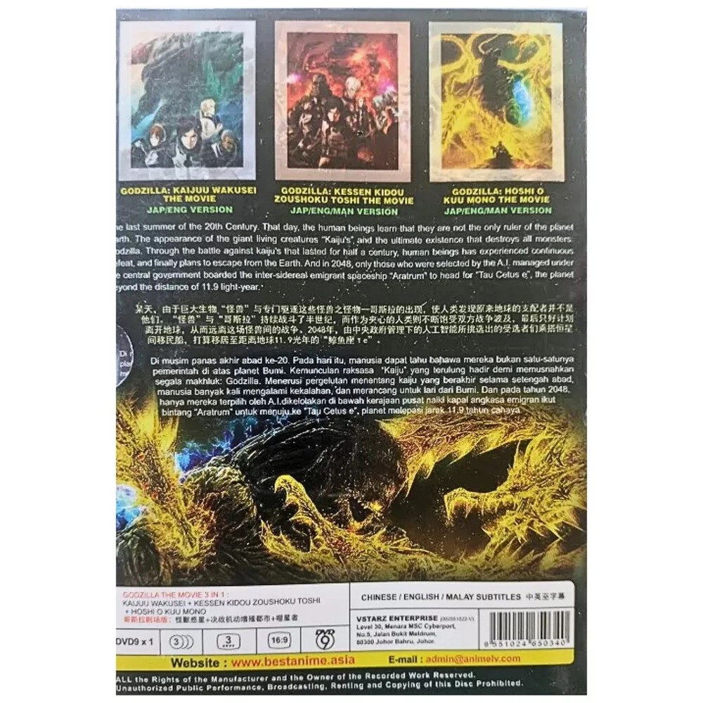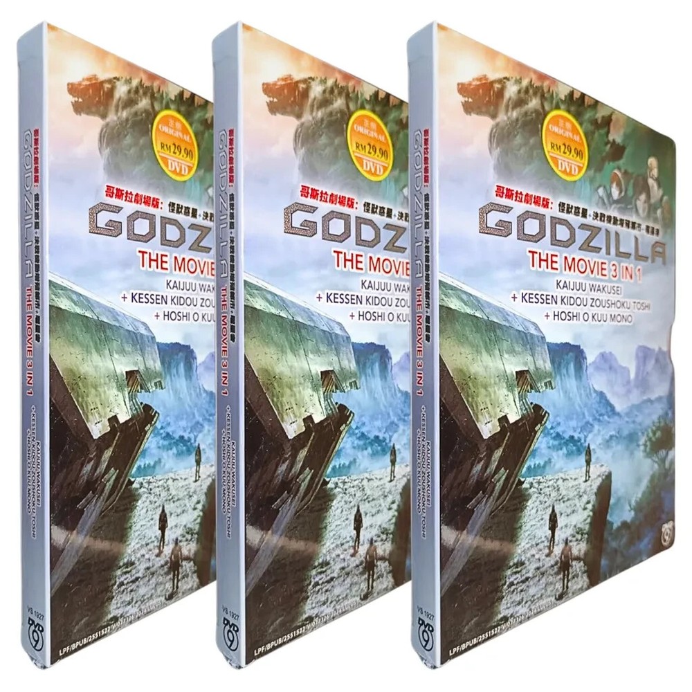The product is a Godzilla movie box set featuring three films: "Kaijuu Wakusei," "Kessen Kidou," and "Hoshi O Kuu Mono." The movies are in Japanese with English subtitles. Directed by Hiroyuki Seshita and produced by TOHO and TOHO animation, the films fall under the sub-genre of Japanese anime. The DVD set includes English and Chinese subtitles, with a runtime of 1 hour and 30 minutes each. =================================================================================================== Number of Disc. : 1 DVD Episodes : 3 Movies Audio (Dialogue): English / Japanese Subtitled : English / Chinese / Malay DVD Region Code : Region Free, All (NTSC)