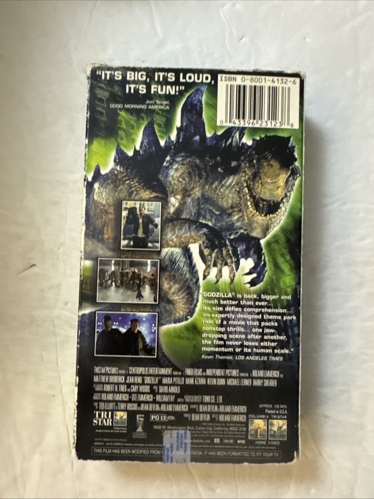 The Godzilla VHS 1998 3-D Case features the iconic sci-fi and fantasy film directed by Roland Emmerich. Starring Maria Pitillo, Jean Reno, and Matthew Broderick, this PG-13 rated movie follows the story of a massive alien creature as it wreaks havoc on New York City. The NTSC signal standard ensures high-quality viewing of this classic 1998 version of the Godzilla film, making it a must-have for any movie enthusiast looking to add this legendary VHS tape to their collection.
