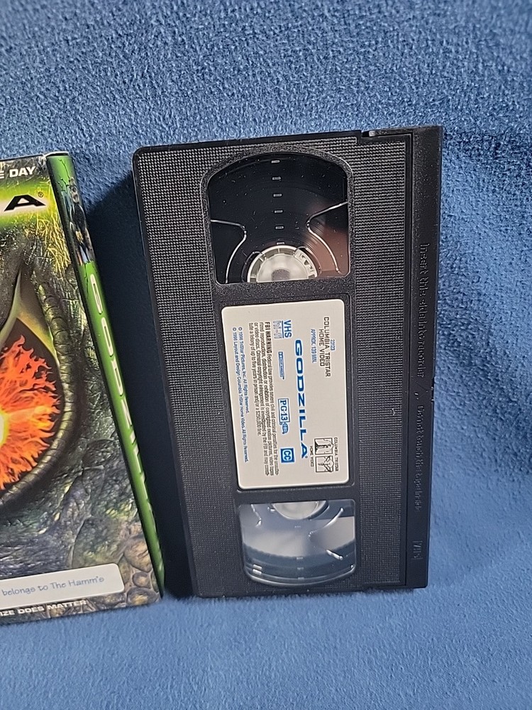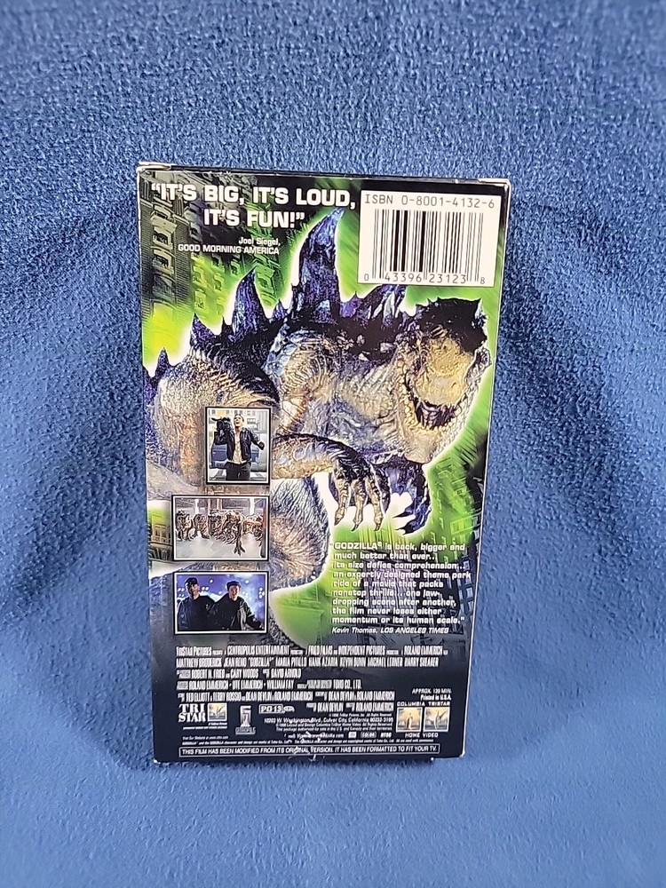 The Godzilla VHS 1998 3-D Textured Case features the iconic sci-fi and fantasy film directed by Roland Emmerich. Starring Maria Pitillo, Jean Reno, and Matthew Broderick, this PG-13 rated movie follows the massive monster as it wreaks havoc on Tokyo. With a NTSC signal standard, this VHS tape offers a nostalgic viewing experience of the classic Godzilla movie from 1998 in a unique 3-D textured case.