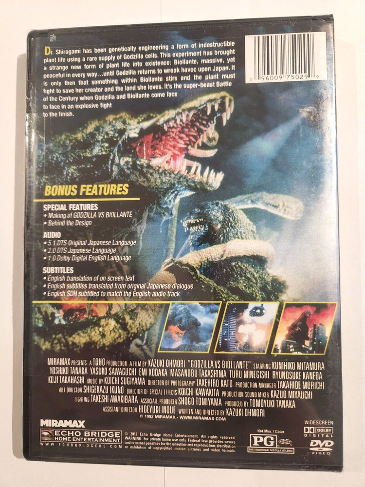 AS SHOWN NEW FACTORY SEALED DVD Region 1 for US DVD Players Original Japanese with English subtitles Echo Bridge Home Entertainment Dr. Shiragami has been genetically engineering a form of indestructible plant life using a rare supply of Godzilla cells. This experiment has brought a strange new form of plant life into existence: Biollante, massive, yet peaceful in every way...until Godzilla returns to wreak havoc upon Japan. It is only then that something within Biollante stirs and the plant must fight to save her creator and the land she loves. It's the super-beast Battle of the Century when Godzilla and Biollante come face to face in an explosive fight to the finish. Special Feature(s): Making of GODZILLA VS BIOLLANTE; Behind the Design; 5.1 DTS Original Japanese Language; 2.0 DTS Japanese Language; 1.0 Dolby Digital English Language; English translation of on screen text; English subtitles translated from original Japanese dialogue