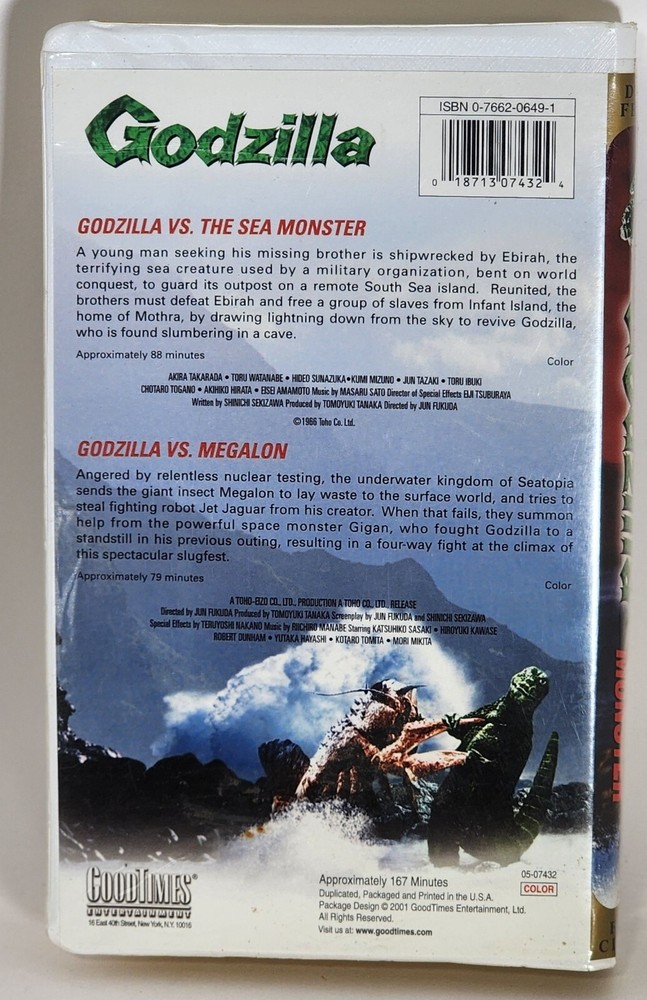 This VHS set includes two classic Godzilla movies, Godzilla Vs. Sea Monster and Godzilla vs. Megalon, both directed by Jun Fukuda. The films feature thrilling battles between Godzilla and various monsters, and are sure to delight fans of the sci-fi and fantasy genre. The set comes in a clamshell case and is in good condition, ready for your viewing pleasure. Message me if u have any questions or concerns on the product and I will respond within the day as quick as possible. I ship on Monday through Friday and Saturday before noon. I ship via USPS Media Mail unless the buyer choose Ground Advantage or priority.