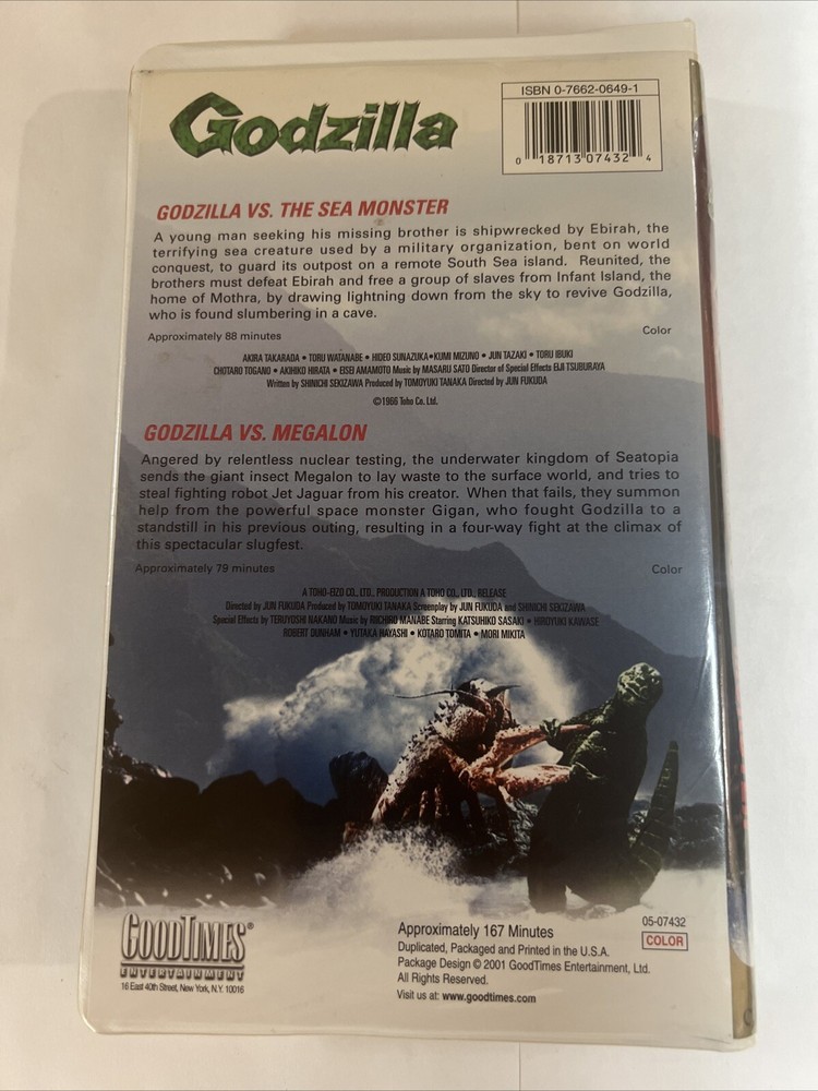 This VHS tape features the iconic Godzilla battling against the powerful Sea Monster and Megalon in an epic showdown. Fans of the classic monster movie will love this action-packed fight, which includes stunning visuals and thrilling sound effects. The tape comes in a protective clamshell case, ensuring that it remains safe and secure for years to come. The release year of this VHS tape is 2001, making it a must-have for any collector or fan of Godzilla. Whether you're a fan of the movies or simply love the idea of monster movies, this VHS tape is sure to impress. Don't miss out on the chance to own this incredible piece of cinematic history.