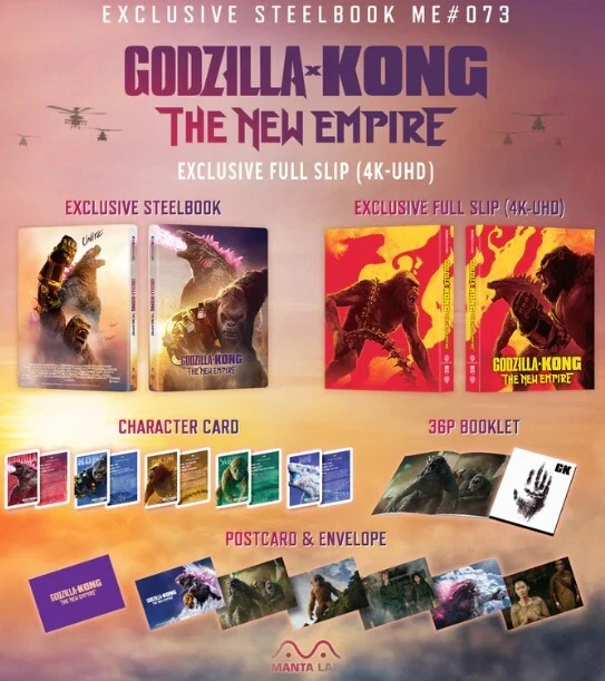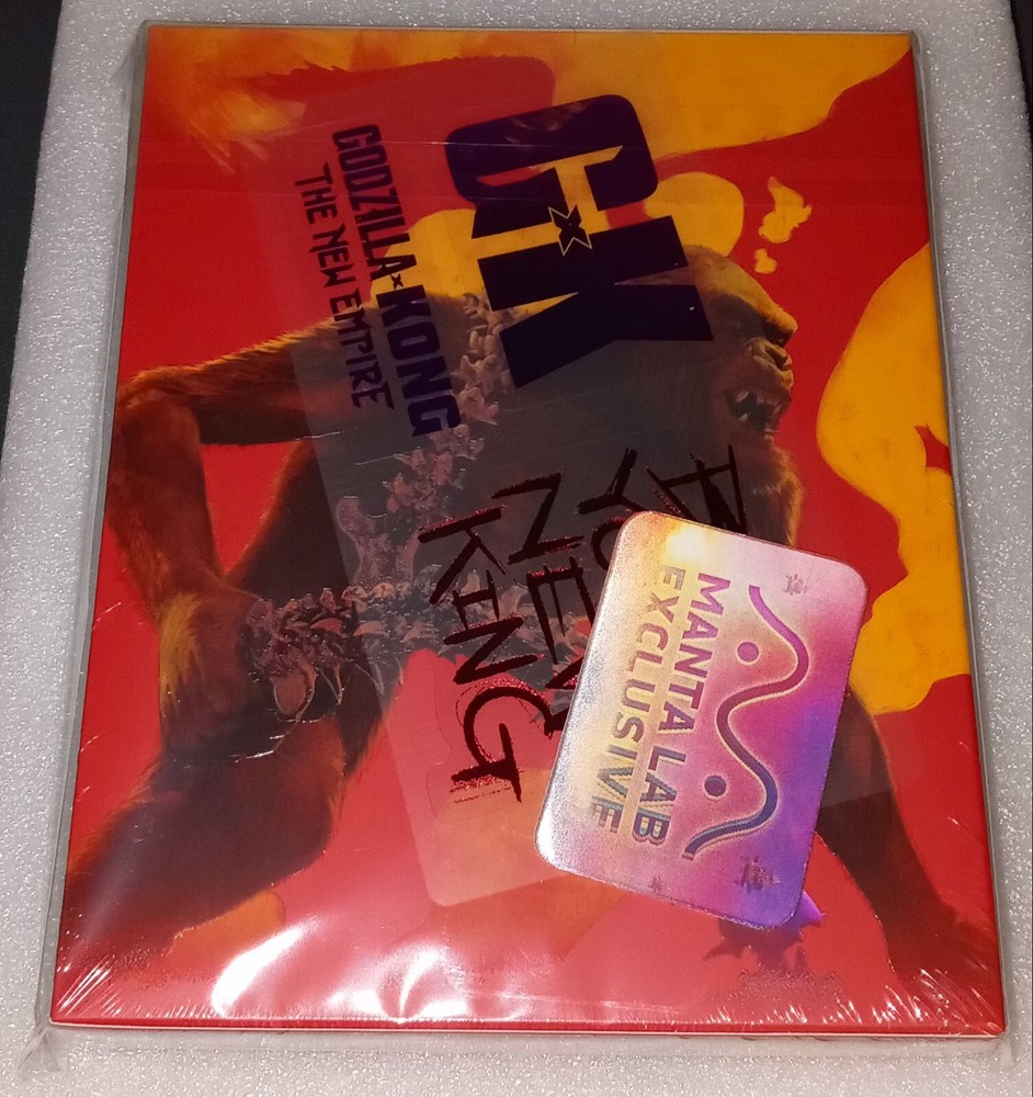 This is for a new & sealed Godzilla X Kong: The New Empire Full Slip SteelBook from Manta Lab. This includes a 4K and a Blu-ray disc. This is number 108/1000. This is sealed so I don't know if there are any imperfections on the Steelbook. There is a small wear spot on the front open side of the slipbox which is how I received it. The last image is an example of what is inside the slip and Steelbook. Keep in mind that eBay now charges tax in most states. Due to ebay's new payments system I will have to wait until the payment clears before I ship this out. Please be aware that this is ebay's doing and not mine. Sorry for any inconvenience. I am selling other movies so please check my other listings.