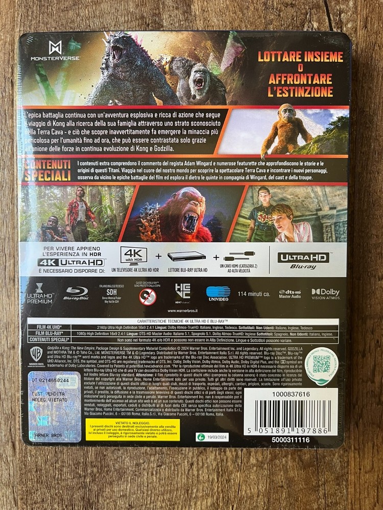 Up for auction : Godzilla X Kong: The New Empire with Steelbook Case (4K UHD + Blu-ray, EU Import, Region Free). This is an Italian import, but the menus/audio track will default to English in your player automatically. Item is BRAND NEW/FACTORY SEALED ! Video Codec: HEVC / H.265 Resolution: Native 4K (2160p) HDR: Dolby Vision, HDR10 Aspect ratio: 2.39:1 Original aspect ratio: 2.39:1 Audio English: Dolby Atmos English: Dolby TrueHD 7.1 (48kHz, 24-bit) Italian: Dolby Atmos Italian: Dolby TrueHD 7.1 German: Dolby Atmos German: Dolby TrueHD 7.1 Czech: Dolby Digital 5.1 Polish: Dolby Digital 5.1 Slovak: Dolby Digital 5.1 Subtitles English SDH, Italian SDH, German SDH, Czech, Korean, Mandarin (Simplified), Polish, Slovak Discs 4K Ultra HD Blu-ray Disc Two-disc set (1 BD-100, 1 BD-50) Packaging SteelBook, Inner print Playback 4K Blu-ray: Region free 2K Blu-ray: Region free Ships within 24 hours via USPS Priority Mail (2-3 days) with delivery confirmation. Returns accepted within 30 days of receiving your item if you're not 100% satisfied! Return shipping will be paid for by the buyer unless a mistake is made on my part. Sorry, no international shipping is available. PayPal payments only please. Bid with confidence! 30 day money back guarantee - all orders go out the following business day - highly rated for BLAZING FAST shipping