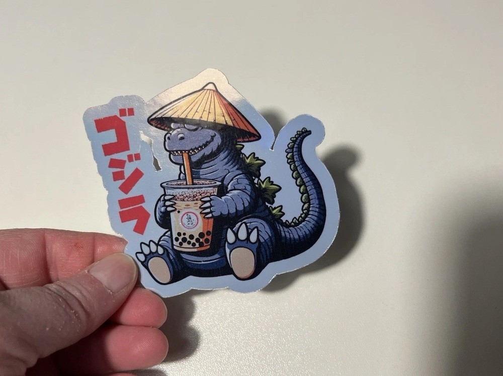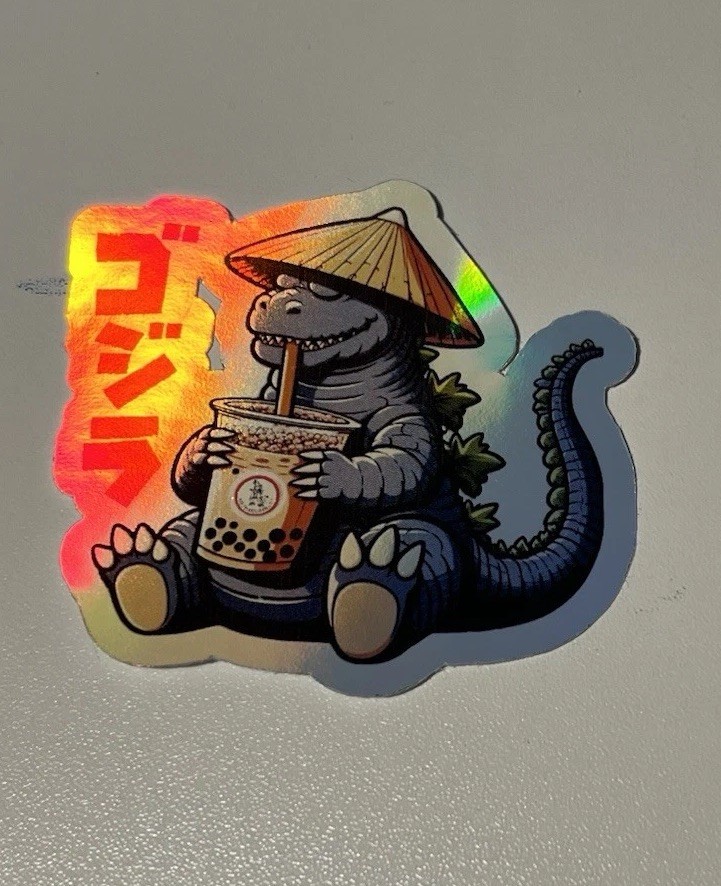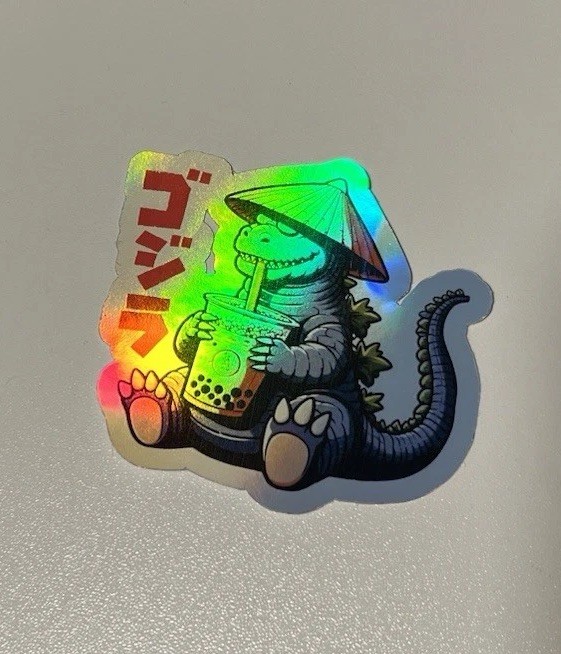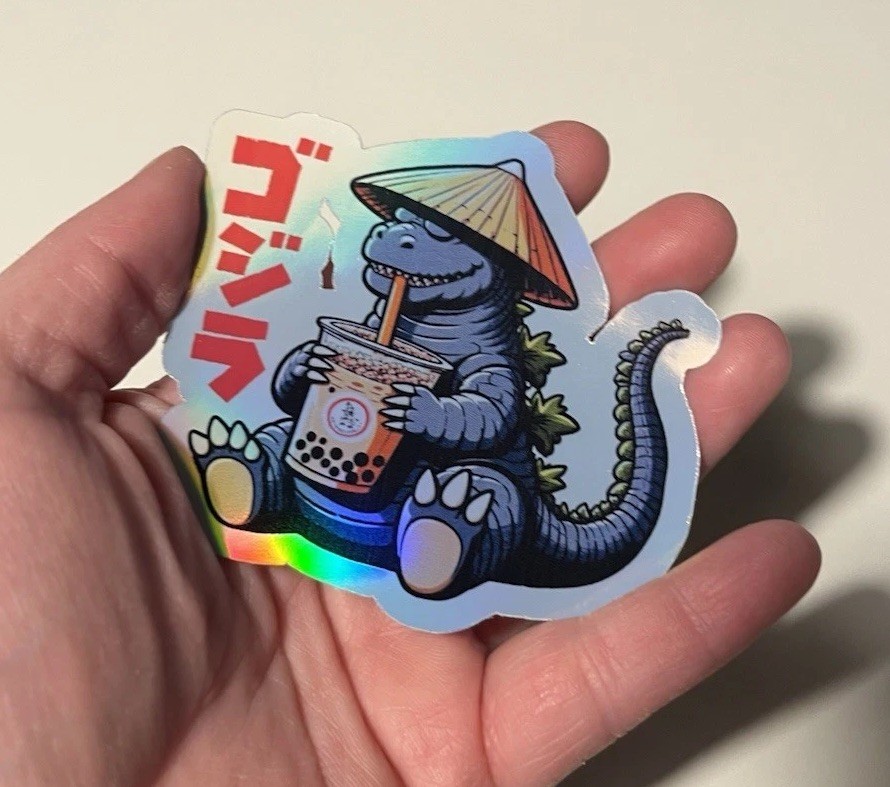Show off your love for the king of monsters with this 3 inch waterproof vinyl sticker featuring Godzilla enjoying a boba tea. Perfect for adding a unique touch to your laptop, tumbler, notebook, tablets, PlayStation, Xbox, or cup. The holographic design and Godzilla drinking a boba tea theme make this sticker a must-have for any Toho fan. Its diecut shape adds a unique touch to your collection, while the waterproof feature ensures that it will last longer. Add some charm to your accessories with this Godzilla sticker.