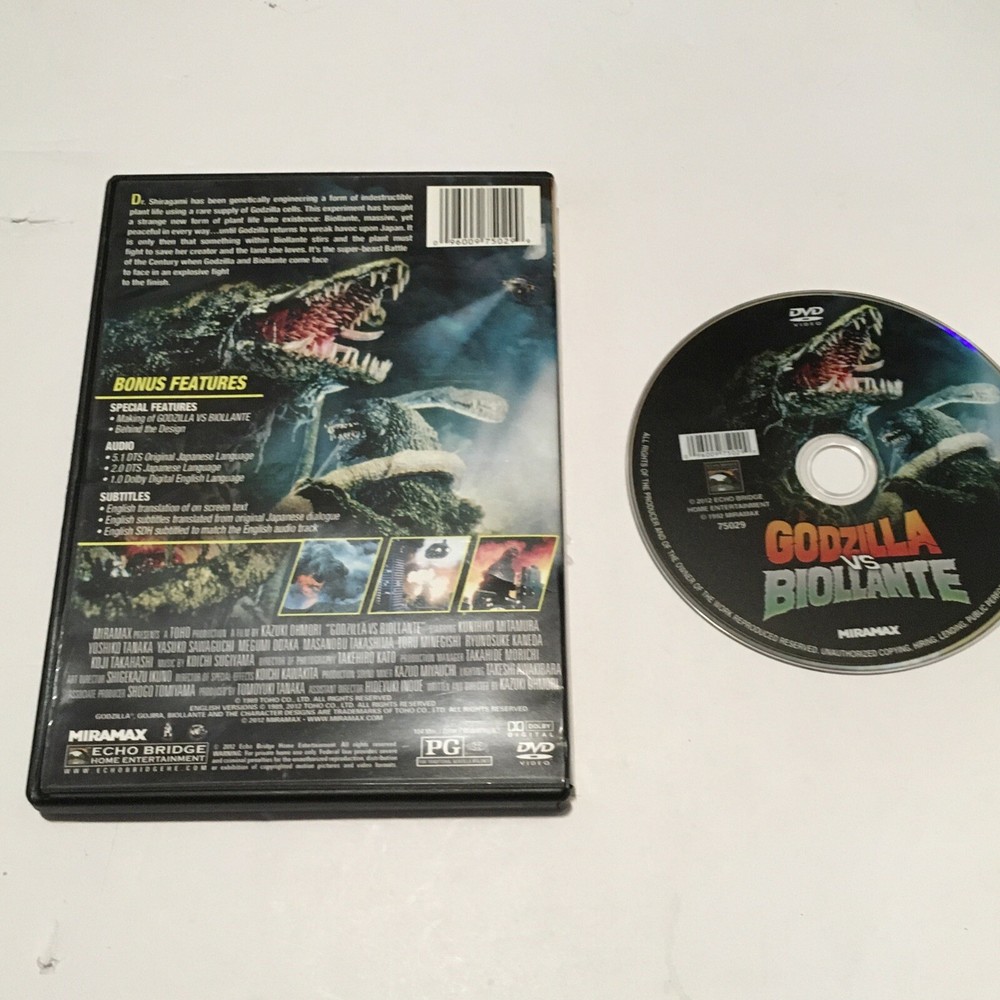 This is a rare and highly sought-after DVD of the classic action and sci-fi film, "Godzilla vs. Biollante". Released in 2012 by Miramax, this limited edition DVD features the widescreen format and is a must-have for fans of the genre. The DVD is in English and Japanese and is compatible with Region Code 1 (US, Canada). The case of the DVD is tall and belongs to the DVD case type. The film is a creature/monster, Japanese sub-genre and belongs to the action, sci-fi & fantasy genre. The DVD features an NTSC video format and is a type of movie. The release year of the DVD is 2012, and it is an out-of-print (OOP) item. This DVD is a perfect addition to any movie lover's collection. Awesome movie and hard to find. The disc is in near mint condition. Great item.