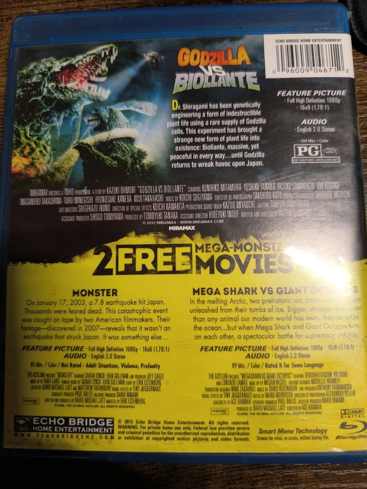 This Blu-ray disc features an epic battle between two giant monsters, Godzilla and Biollante, as well as a thrilling chase scene between a monster and a mega shark. The disc is region-free and has a widescreen format, making it a great addition to any horror and suspense movie collection. The case is a standard Blu-ray case and the language is English. The disc was released in 2013 by MIRAMAX and is rated R. This is a must-see movie for fans of horror and suspense.