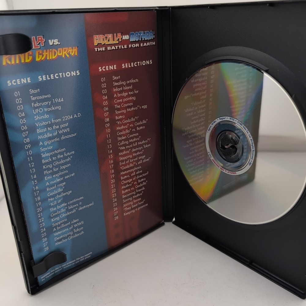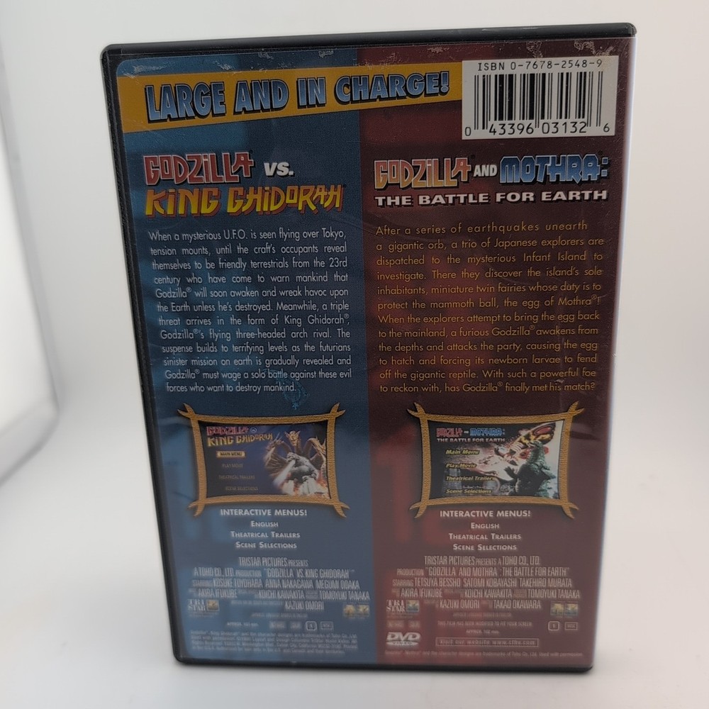 The Godzilla vs King Ghidorah/Mothra the Battle For Earth DVD Double Feature 1998 showcases two iconic Godzilla films in a tall DVD case. Directed by Kazuki Ohmori and Takao Okawara, the movies feature creature battles and a Japanese sci-fi fantasy setting. With a runtime of 205 minutes and dubbed in English, this DVD includes the classic Godzilla Vs. Mothra and Godzilla Vs. King Ghidorah films in full screen format. Perfect for fans of the Godzilla franchise, this double feature is a must-have addition to any movie collection.