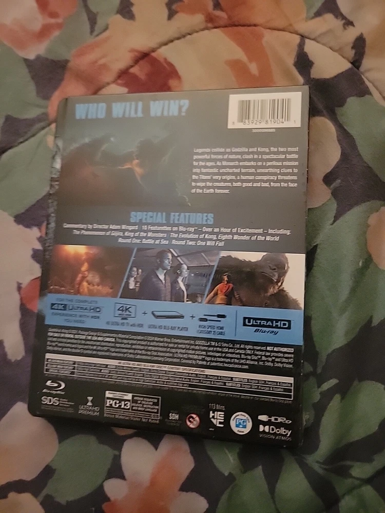 Get ready for an epic battle with this limited edition Godzilla vs Kong Glow in the Dark Steelbook. This movie is packed with action, adventure and mystery, and is perfect for fans of creatures and monsters. Directed by Adam Wingard and starring Kyle Chandler, this film promises to keep you on the edge of your seat. This 4K UHD Blu-ray version comes with a sleeve and features commentary, behind the scenes featurette and widescreen format. Rated PG-13, this movie is suitable for all audiences. Don't miss out on this Steelbook edition of Godzilla vs Kong, the ultimate addition to any movie collection.
