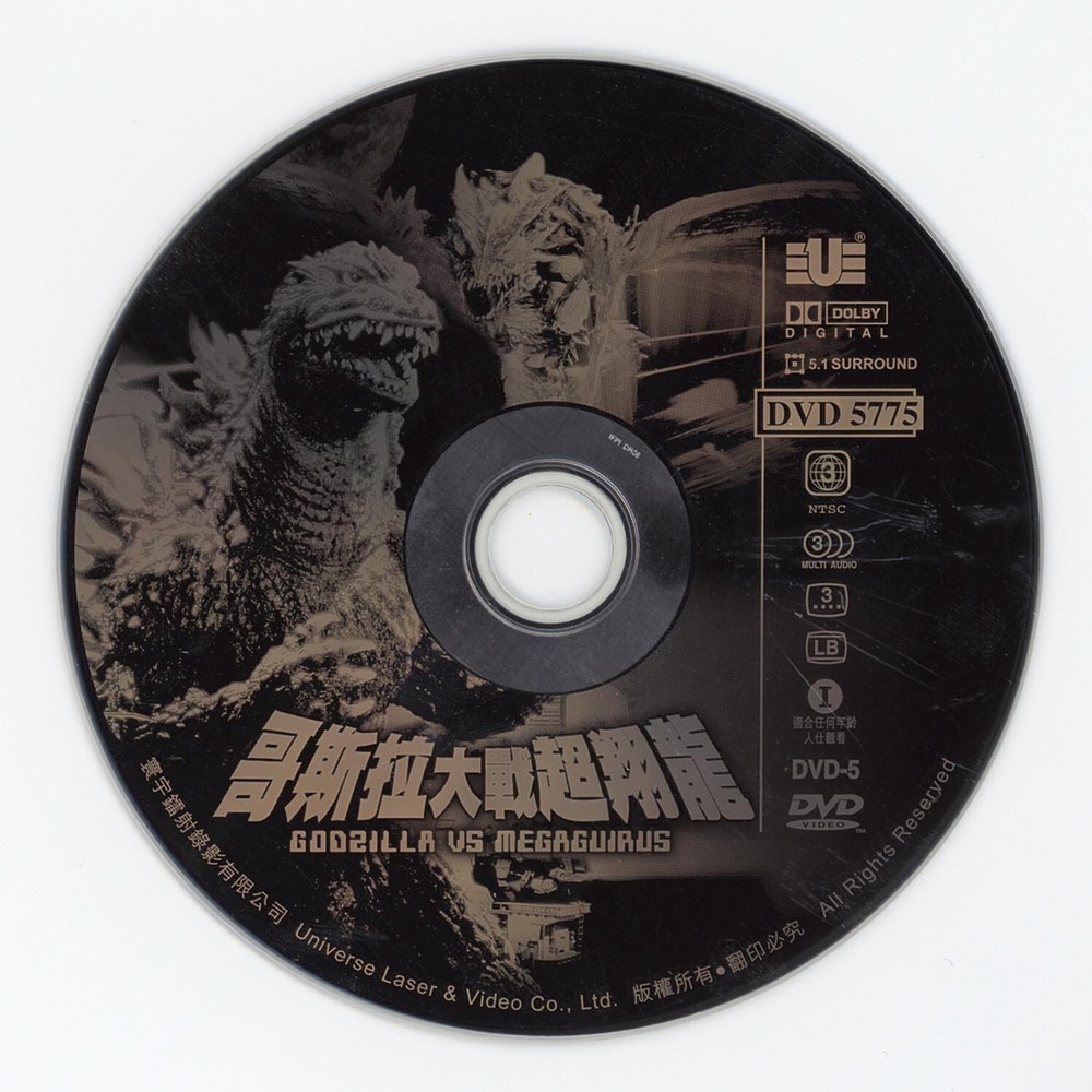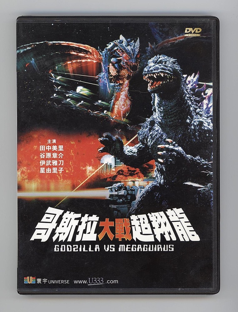 Rare 2000 Hong Kong DVD release of Japanese Kaiju film, Godzilla vs. Megaguirus. Presented in Japanese 5.1 Surround Dolby Digital as well as dubbed Cantonese 5.1 Surround Dolby Digital & Stereo. Removable subtitles in English, Traditional Chinese and Simplified Chinese. Letterbox format. Disc in excellent shape. No scratches or fingerprints. Plays perfectly. Attractive laser etching. Cover has very minor scuffs due to storage but cover slipsheet in excellent condition. Please see photos for more detail. • DVD is Region 3 and can only be played on region free players *
