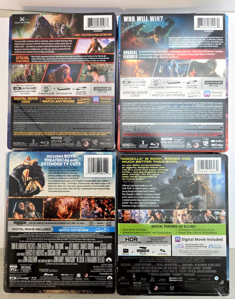 Own: Godzilla Vs. Kong 4K 4K + Blu-ray + Digital Copy Sold-Out Walmart Exclusive Steelbook & Godzilla x Kong: The New Empire 4K 4K + Blu-ray + Digital Copy Sold-Out Walmart Exclusive Steelbook & King Kong (1976) 4K 4K + Blu-ray + Digital Copy + Slip Cover Limited Edition Steelbook & Godzilla (1998) 4K 4K + Blu-ray + Digital Copy Sold-Out Best Buy Exclusive Steelbook No dents, no scratches! FACTORY SEALED U.S. RELEASES Ships in a padded box with a tracking number (in the U.S)