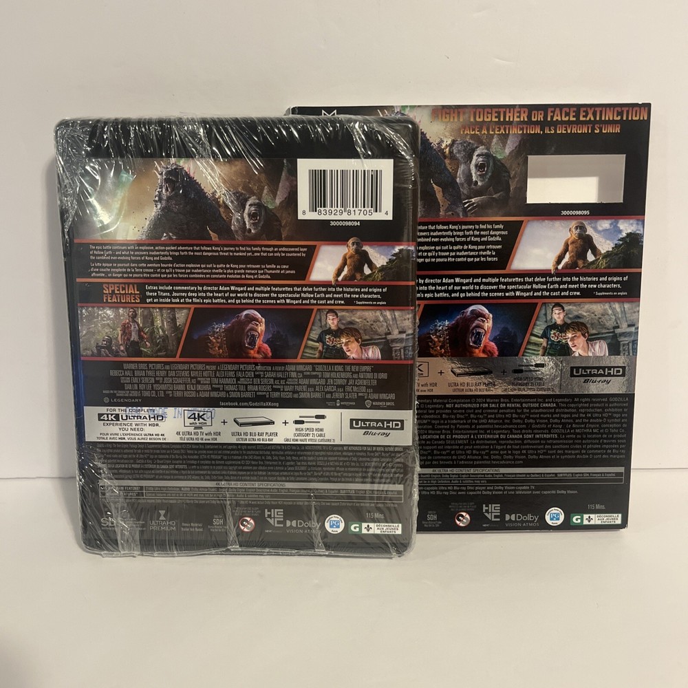 Godzilla x Kong: The New Empire - 4K Ultra HD + Slipcover is a must-have for fans of epic monster battles. Released in 2024 by Warner Bros., this PG-rated film offers thrilling action and stunning visual effects. This new, factory-sealed package includes the highly sought-after slipcover, making it a valuable addition to any DVD & Blu-ray Disc collection. Get ready to experience the ultimate showdown between two iconic titans in crystal-clear 4K resolution. Order yours today and bring home the excitement of Godzilla x Kong: The New Empire.