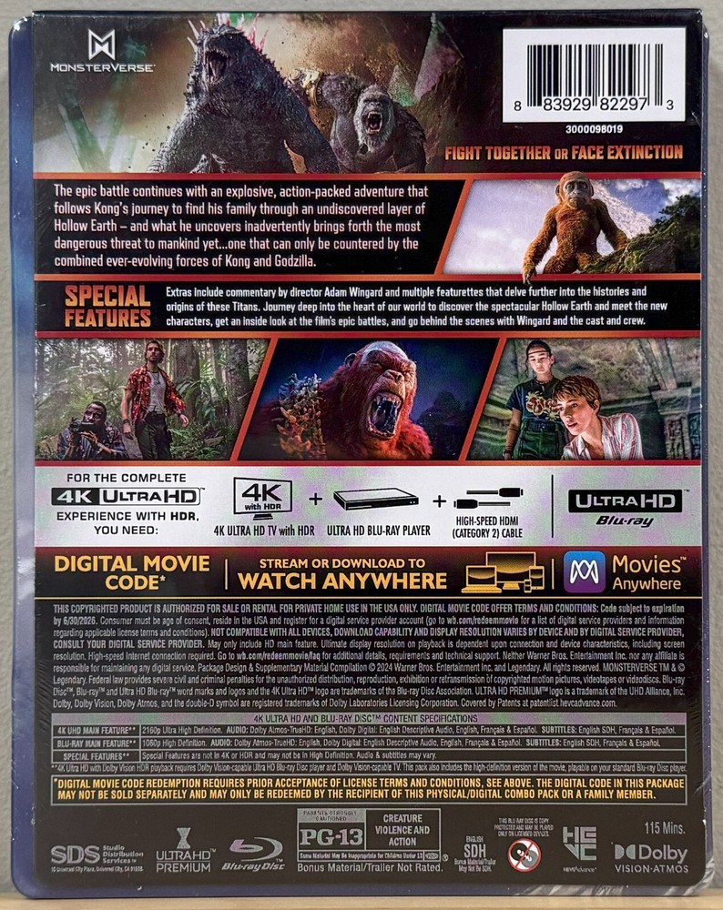 Godzilla X Kong: The New Empire WalMart Exclusive 4K Ultra HD Blu-ray Steelbook Steelbook is NEW/FACTORY SEALED Digital Copy IS Included Steelbook has NO VISIBLE DENTS, DINGS OR SCRATCHES NO LOOSE DISCS ORIGINAL OWNER SAME DAY SHIPPING Steelbook comes from a SMOKE FREE/CHILD FREE ENVIRONMENT Steelbook is shipped in a CARDBOARD BOX with BUBBLE WRAP and AIR PILLOWS (Please refer to the photos) Steelbook is shipped via USPS Ground Advantage (3 to 5 day delivery and $100 insurance) Please click on the link to view my other auctions I will combine shipping on multiple items Please contact me with any questions Thank you for bidding