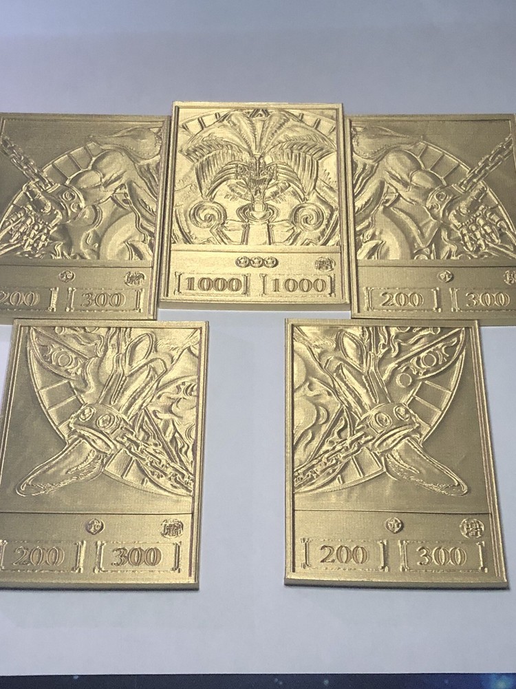 Gold 3D Exodia The Forbidden One. Gold 3D Right-Arm Of The Forbidden One. Gold 3D Left-Arm Of The Forbidden One. Gold 3D Right-Leg Of The Forbidden One. Gold 3D Left-Leg Of The Forbidden One. All cards are the Anime Versions. Standard Yu-Gi-Oh Card size with added depth for 3D effect. Cards are 3D Printed and painted gold.