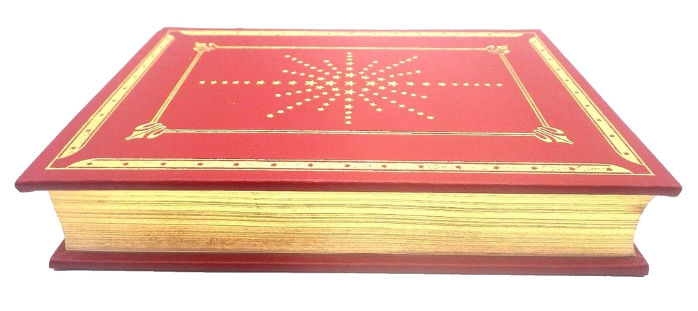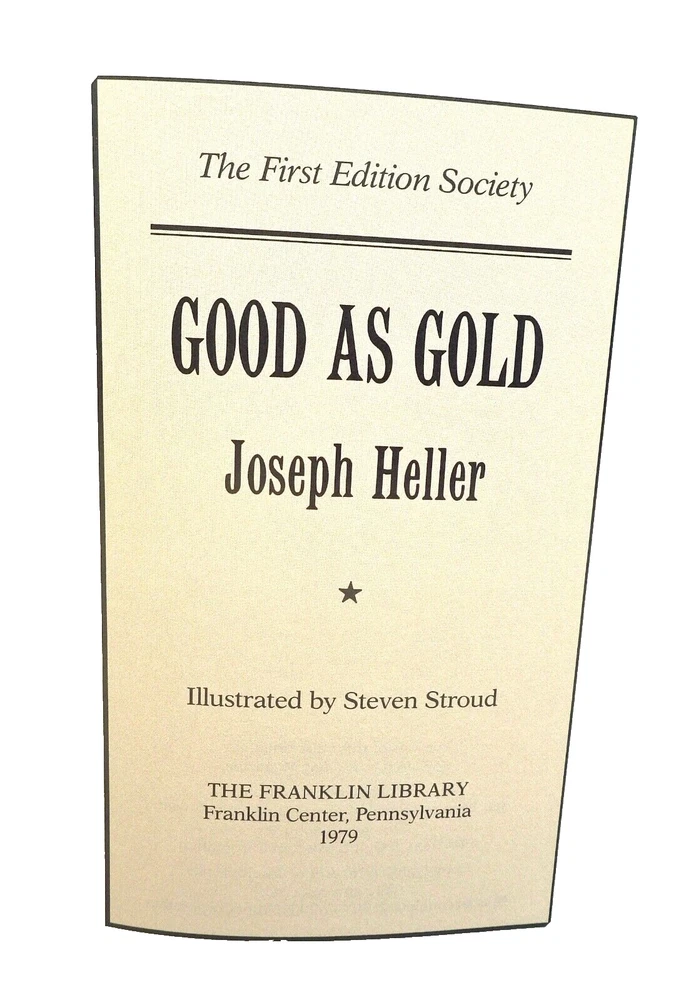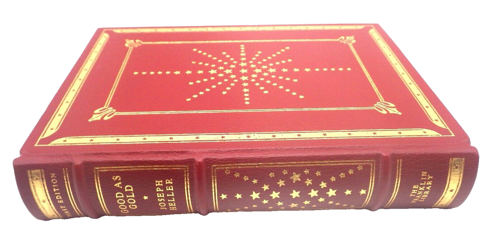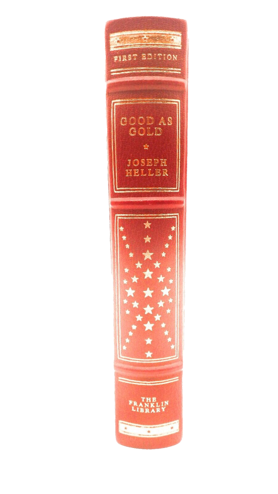 GOOD AS GOLD, Joseph Heller. Illustrated by Steven Stroud, 521 pp. First edition in 'The First Edition Society' series, published as a limited edition by The Franklin Library, 1979. 8vo size book, gilt titled and stamped full red leather; moire pale peach linen endpapers, all edges gilt, linen bookmark present. Fine, Like New Joseph Heller (May 1, 1923 – December 12, 1999) was an American author of novels, short stories, plays, and screenplays. His best-known work is the 1961 novel Catch-22, a satire on war and bureaucracy, whose title has become a synonym for an absurd or contradictory choice. He was nominated in 1972 for the Nobel Prize in Literature.