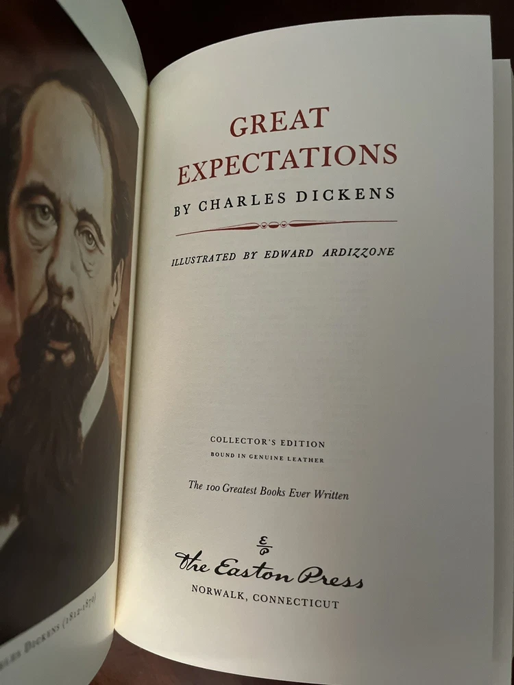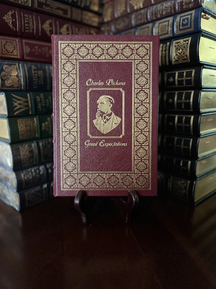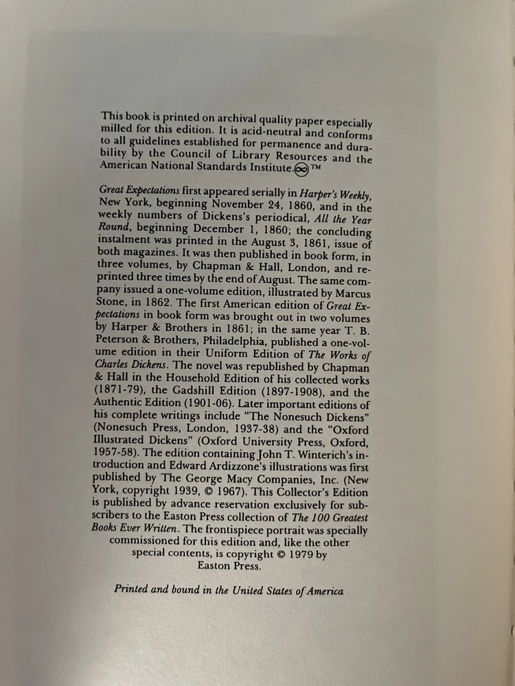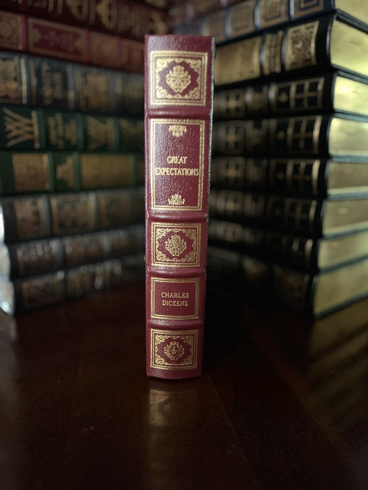 This volume is in like new condition. Though it has been unwrapped, it has never been read. I am the only person who has ever owned this book and it’s been in my bookcase undisturbed for years. The book still cracks loudly when you open it and has not been handled much at all. In fact I am the only person to ever touch this book. The only way they have ever been cleaned is a light dusting with a clean, dry microfiber cloth. Featuring acid-neutral archival quality paper, 22k gold accents, a satin ribbon page marker, moire fabric end sheets, and beautiful leather binding; this books is a fantastic addition to any collector’s library. This collector’s edition of Great Expectations by Charles Dickens is a must-have for any fan of fictional literature, and this Easton Press edition was made for collectors of fine books. Feel free to ask any questions you may have as there are no returns on this purchase. It has a shipping weight of about 4 pounds. I will pack it with extreme care to ensure you will receive the book in the same beautiful condition it is in now.