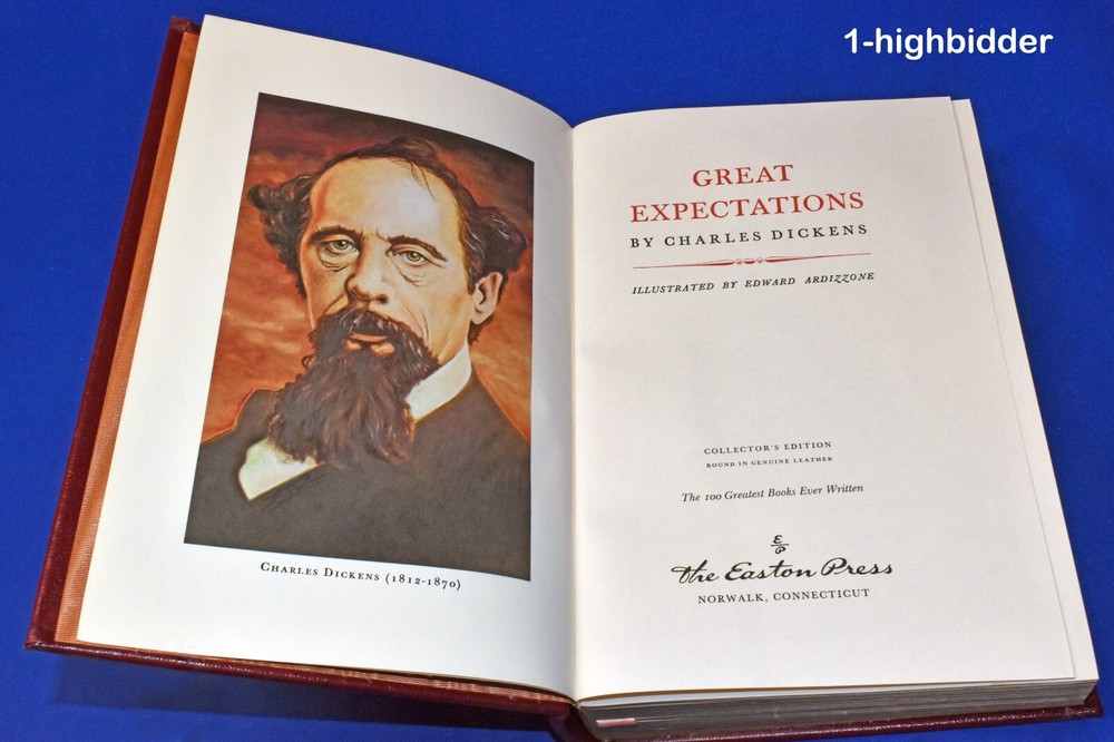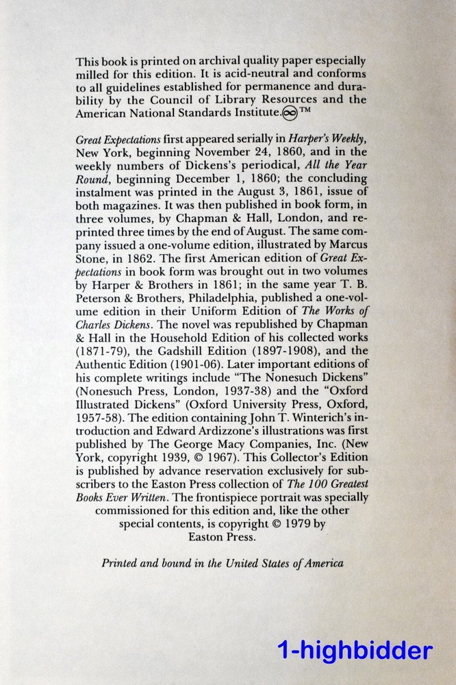 Great Expectations Charles Dickens Leather Easton Press 1979 Collector's Edition __________________________________ Great Expectations by Charles Dickens 100 Greatest Books Ever Written Series Published by Easton Press, Norwalk CT (1979) Condition: EXCELLENT++ 1st Thus Collector's Edition Easton Press Leather Bound Book! NO TEXTUAL MARKS! The binding is tight and all 457 pages within are bright white with NO writing, underlining, high-lighting, rips, tears, bends, or folds. The covers look excellent with superficial marks at the top of the spine. The gold gilt page edges are near perfect, and the inner book appears unread and perfect. The sewn-in silk marker appears to be in the same pages as when it was placed there by the publisher. You will be happy with this one! Always handled carefully and packaged securely! Buy with confidence from a seller who takes the time to show you the details and not use just stock photos. Please check out all my pictures and email with any questions! Thanks for looking! About Great Expectations: Charles Dickens's Great Expectations is a bildungsroman that chronicles the life of Pip, an orphan residing in the marshes of Kent with his harsh sister and her kind-hearted husband, Joe Gargery. Pip's life takes a dramatic turn when he aids an escaped convict, Abel Magwitch, by providing him with food and a file for his leg irons. Despite Magwitch's subsequent capture, this act of kindness sets off a chain of events that will shape Pip's destiny. He becomes entangled with the reclusive and wealthy Miss Havisham and her beautiful yet cold-hearted ward, Estella, with whom Pip falls deeply in love. An anonymous benefactor later provides Pip with the means to move to London and pursue the life of a gentleman, leading him to harbor "great expectations" about his future and social standing. Throughout the narrative, Pip navigates the complexities of ambition, social class, and personal growth, ultimately learning that true worth is not defined by wealth or status, but by character and integrity. About the Book: This book includes the classic Easton Press signature features: * Premium Leather * Silk Moire Endleaves * Distinctive Cover Design * Hubbed Spine, Accented in Real 22KT Gold * Satin Ribbon Page Marker * Gilded Page Edges * Long-lasting, High Quality Acid-neutral Paper * Smyth-sewn Pages for Strength and Durability * Beautiful Illustrations About Easton Press Books (from their website): Easton Press is a world-leader in the design and development of fine leather-bound books, stamped on the spine with 22kt gold. For over three decades, we have been serving the needs of collectors to acquire luxurious volumes of lasting meaning, beauty and importance. We take great pride and pleasure in presenting collectors and enthusiasts with a wide variety of heirloom editions, made to exacting standards and meant to be cherished for generations of readers. You will savor the classic editions of Moby Dick, Jane Eyre, and The Odyssey with our landmark series, The Greatest Books Ever Written. We continue to offer exquisite signed editions by distinguished authors such as Diana Gabaldon, Anne Rice, Neil Gaiman, Madeleine Albright and Condoleezza Rice. Our Deluxe Limited Editions, hand-numbered and beautifully re-created from important historical volumes, will delight even the most discerning book collectors. And our superb selection of leather-bound coffee-table books make the perfect gift for any sports, history, or children's book collector. These are just a few of our many selections. Easton Press editions are bound in the U.S.A. with imported materials and have been shipped to collectors in 130 countries around the world. Copyright © 2018-2025 TDM Inc. The photos and text in this listing are copyrighted. I spend lots of time writing up my descriptions and despise it when un-original losers cut and paste my descriptions in as their own. It is against ebay policy and if you are caught, you will be reported to ebay and could be sued for copyright infringement and damages.