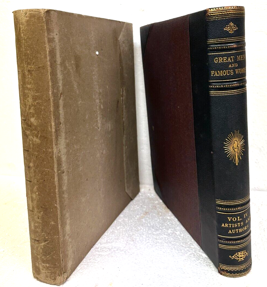 GREAT MEN AND FAMOUS WOMEN A Series of Pen and Pencil Sketches of the Lives of More than 200 of the Most Prominent Personages in History Volume IV Artists and Authors edited by Charles F. Horne Published: Selmar Hess, Publisher, New York - 1894, First Edition This hardcover book measures 9 1/2" X 11 3/4" - 384 pages, with B&W text illustrations, plus 18 B&W photogravures, and 30 B&W plates. This volume is one of what appears to be a four-volume set. We believe this set is a First Edition, First Printing of Great Men and Famous Women, dated 1894. In attempting to ascertain a value on Bookfinder we found these books were in the listings mixed with a cheaper and of less quality eight-volume set from the same publisher. Oddly enough we have (had) volumes 1-4 of this set in our inventory. They are also dated 1894, with no mention of the originals. There appears to be NO distinction between the two on Bookfinder. You will notice we designated the lesser quality four volumes as a Later Edition. Apparently at some point the quality four-volume set was broken into eight parts by the publisher. These inferior versions of the originals lack the gilt edged pages, the quality leather spines and corners, fine end papers, and are printed on stock of a lesser quality. We are offering these four quality original volumes not as a set since some people might have one or more in their libraries. We can always sell all four together to an interested party. What is also of note are the slipcases (see image) on volumes 2, 3 & 4 which have kept the conditions of these volumes in Near Fine over the years. The book is half leather bound, with gold inlay on the front and spine, and all the page edges gilted. There is some minor wear to the corners, with the book remaining in Near Fine condition or better. Free U. S. Media S&H. Parcel post and priority mail available upon request at an additional cost. Combined S&H available. International S&H higher. Please E-mail us with any questions. Thanks for looking!