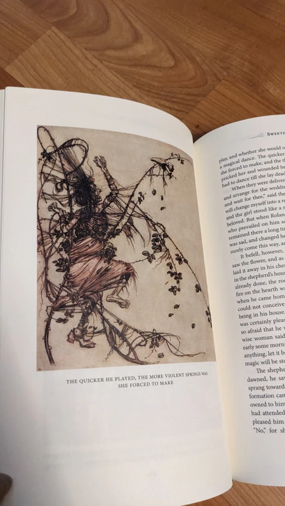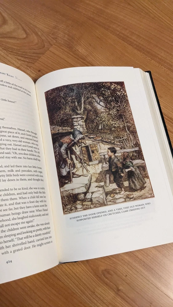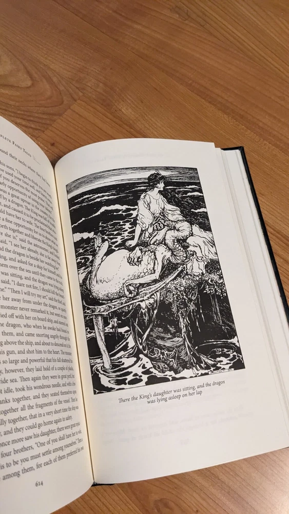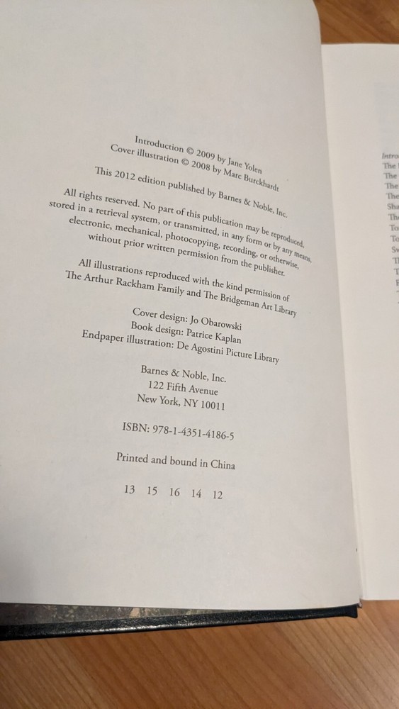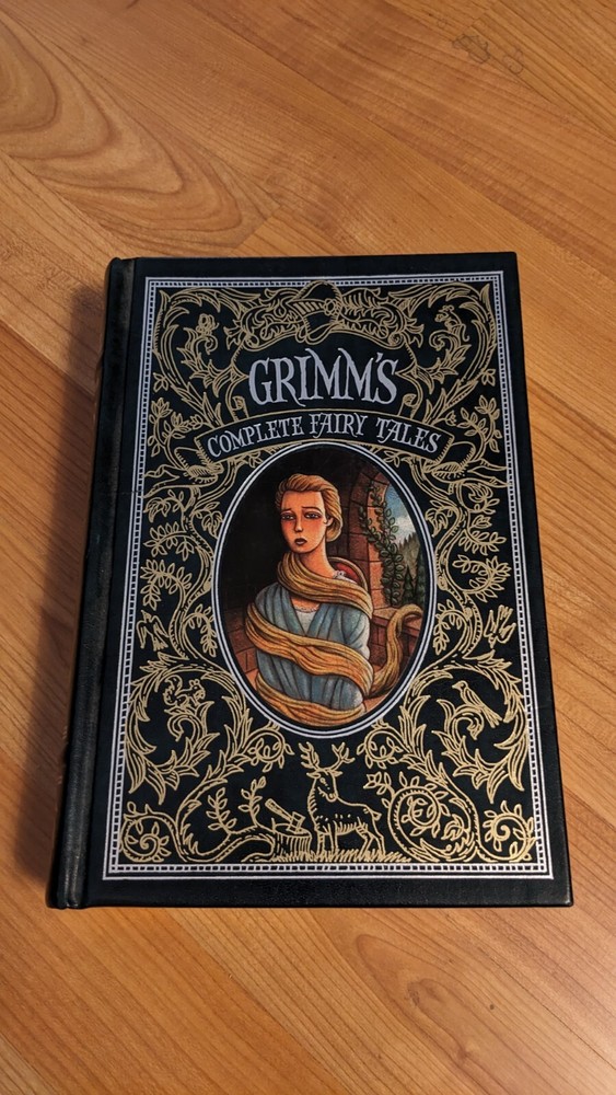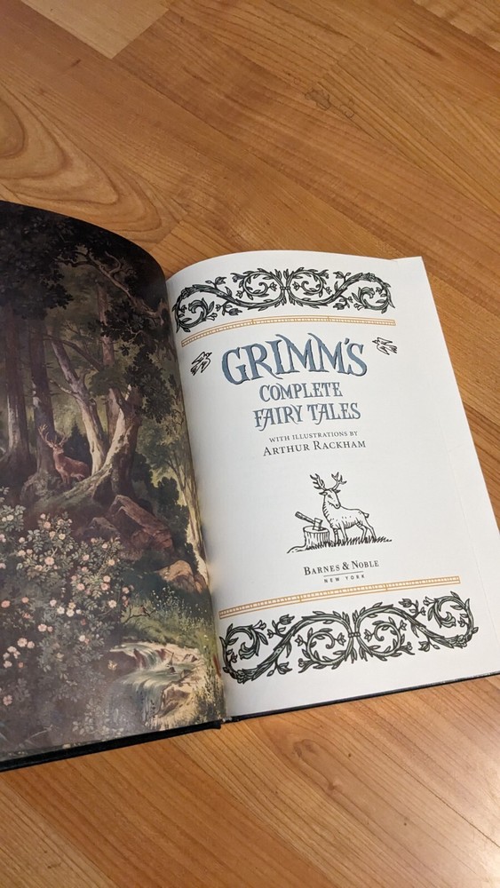 Grimm's Fairy Tales is a leather-bound classic book published by Barnes & Noble in 2009. The book features the English version of the Brothers Grimm's fairy tales, illustrated by Arthur Rackham. The book is not signed or personalized and is published in the United States. The subject of the book is children's fairy tales and fantasy no writing or highlights.